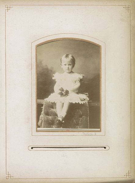Curator: Before us is a mounted photograph from September of 1898 by Charles E. Smith, simply titled "Untitled (full length portrait of boy standing...)." Editor: The first thing that strikes me is the contrast—the boy's stark white dress against the hazy, indeterminate backdrop is quite arresting. Curator: The composition draws the eye upwards, doesn't it? The meticulous arrangement of light and shadow creates a pyramidal structure, leading us to the subject's face. It is a classic portrait composition for the time, of course. Editor: Yes, but consider the social context. This was an era deeply entrenched in Victorian ideals about childhood innocence and gender performance. The boy’s frilly attire, though typical for toddlers regardless of sex, is highly performative, perhaps reflecting societal expectations. Curator: Indeed. And the formality is interesting. It’s not just a snapshot but a carefully posed presentation, isn’t it? Note the deliberate placement of his hands, the controlled stance. Editor: It speaks volumes about the intersection of class, identity, and representation. Curator: I concur. It’s a testament to the enduring power of visual form to reveal and conceal. Editor: Yes, and the photograph reminds us that even the most intimate portraits are always mediated through the lens of power.