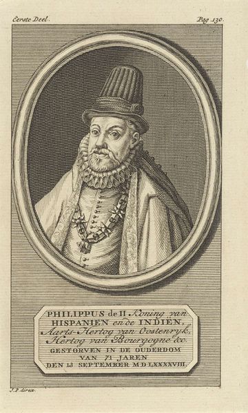 Curator: Jan Punt created this engraving in 1749. It's entitled "Portret van Maximiliaan II, keizer van het Heilige Roomse Rijk," a portrait of Maximilian II, Emperor of the Holy Roman Empire. It's on display here at the Rijksmuseum. Editor: The intricacy is compelling, but there's a melancholic air to the piece, isn’t there? The textures created with such fine lines—the fur trim, the feathered cap—almost feel…funereal. Curator: The clothing speaks volumes. The feathered cap, the heavy chain... these are more than decorative items; they represent imperial power, lineage, and authority. Maximilian's steady gaze holds a cultural memory of empire. Editor: But also of its burden, I think. Look at how the lines around his eyes suggest weariness. Jan Punt is creating textures of power, yes, but with such precise hatching, almost evoking fragility. Curator: Consider, too, the context of the portrait. These depictions, especially in print, reinforced and legitimized rule, embedding it within the collective consciousness. Each symbol worked as propaganda. Editor: Propaganda, yes, but also the performance of power. The oval frame constricting his figure contributes to this formal, almost ritualistic, presentation of the Emperor. It feels staged. Curator: Absolutely, and consider the Latin text beneath the portrait – *Maximilianus II, by the grace of God, Holy Roman Emperor...*. Language, like imagery, sanctifies rule. He's situated within a divine narrative. Editor: The print medium itself also seems significant. Its relative affordability meant wider distribution, furthering the dissemination of Maximilian’s image. Yet the meticulous rendering belies the means of production, obscuring its potentially revolutionary reach. Curator: An intriguing tension – widespread distribution carrying weighty symbolic value, solidifying existing hierarchies. I now have a new appreciation of how portraiture can work across social fabrics. Editor: And I see the subtle ways visual textures speak not only of imperial power, but to the inherent constraints of that power—of his humanity and its finitude. Thank you for bringing the piece into a broader cultural context.