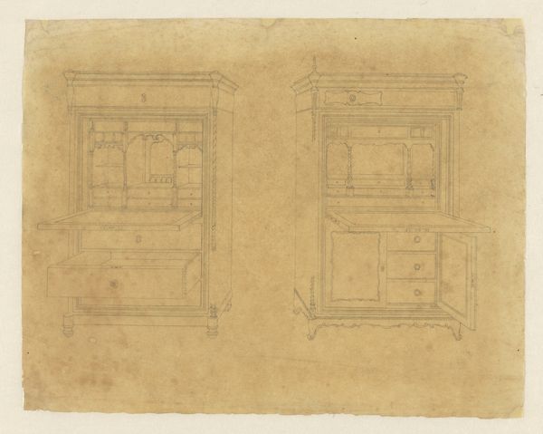 Curator: This fascinating sketch, attributed to B. Winghofer, dates from around 1852 to 1855 and presents two design proposals: one for a writing desk with a bookcase and the other for a cabinet, probably intended for displaying silverware. Editor: My first thought is that there's something delicate and tentative about the lines, despite the obviously elaborate intentions behind these furniture designs. The pencil work feels light, almost like a whisper of opulence. Curator: Absolutely, it’s crucial to consider the historical context here. Winghofer likely operated within the artistic norms and expectations of the mid-19th century. Designs such as this showcase the academic approach favored then, aiming to reflect a refined aesthetic and the era’s aspirations toward higher learning and cultured domestic life. Editor: And what was the probable production process of creating such elaborate furniture at this time? How were pieces like this commissioned, fabricated, and then ultimately integrated into people’s everyday lives, considering the craftsmanship and labor it demanded? Curator: The client-patron relationship would've been integral; such ornate furniture signifies status and access, involving consultations, bespoke designs and a specific kind of patronage to dictate and approve what styles and symbols would best convey one’s desired standing within their social milieu. These designs served, in effect, as a visualization of aspirations to rise above prevailing standards, literally embedding values within the grain. Editor: The intricate detail – I imagine each curve of the embellishments and flourishes needed a highly skilled artisan. It's amazing to think about the process of converting a relatively ephemeral sketch into a sturdy material reality, transforming the potential implicit on paper into tangible social performance within wealthy households. Curator: Precisely. And further, consider the visual language employed. These objects embody societal values surrounding literacy and status. A prominent writing desk coupled with shelves suggesting overflowing knowledge—both symbolize enlightenment within the household’s curated spaces. It acted almost as advertisement of intellectual achievement. Editor: So we shift our focus now, we're looking at furniture no longer just as utilitarian objects, but as material artifacts deeply implicated in complex networks of social aspirations, and markers of cultural capital. It's about who had the privilege, and means to show, through labor-intensive crafted objects, participation in a certain cultivated lifestyle. Curator: I would conclude that it’s really revealing when examining designs from this perspective: a window into visualizing societal ideals, tastes, and ambitions encapsulated within our material heritage. Editor: A pencil line holding the weight of culture. It is pretty interesting how art making and craft production intertwine to shape, reflect and perpetuate ideas.