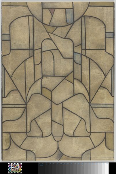 Curator: This work is titled "Ornament met bloemknop," or "Ornament with Flower Bud," a watercolor and colored pencil drawing by Reinier Willem Petrus de Vries, dating roughly from 1884 to 1952. Editor: The color palette feels muted, almost intentionally restrained, which is an interesting choice. The dark corners and overall symmetry give it a calm, if slightly somber, quality. Curator: Considering its function as an ornament, the choice of materials - watercolor and colored pencil - speaks to its likely purpose as a design element meant for reproduction. The relative ease and affordability of these media align with broader accessibility of Art Nouveau designs during this period. We see it’s a work on paper, likely meant to be transferred onto something else. Editor: Absolutely. The bud motif itself is rich with symbolism, representing potential and growth. However, the closed nature of the bud also hints at unrealized possibilities, maybe even a sense of melancholy if you consider the brown hues dominating the drawing. The curvilinear lines pull the eye, as well. Do you see this flower presented frontally and symmetrically almost echoes ancient depictions of the Tree of Life? Curator: That's a fascinating interpretation. I'm more drawn to considering how de Vries, as an artist trained in the decorative arts, would have been keenly aware of the market demand for such designs. Mass production changes the reception of art and craft. The line quality, for instance, looks very precise but doesn't show evidence of unique craft. This all probably relates to industrial methods and possibly influenced the choices behind media. Editor: Interesting point. Still, regardless of its industrial context, the persistent use of floral imagery taps into archetypal longings for beauty and renewal that transcend any particular era. The symbolism is still there; how people process this can still remain in us today. Curator: Fair enough. Ultimately, it reveals the entanglement of artistic intention, industrial processes, and lasting cultural symbolism. Editor: Exactly. It offers a quiet but persistent statement. Something very potent resides there.
