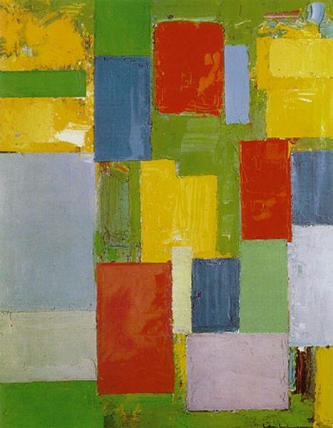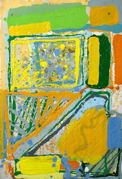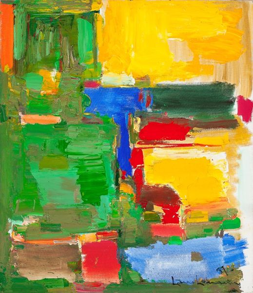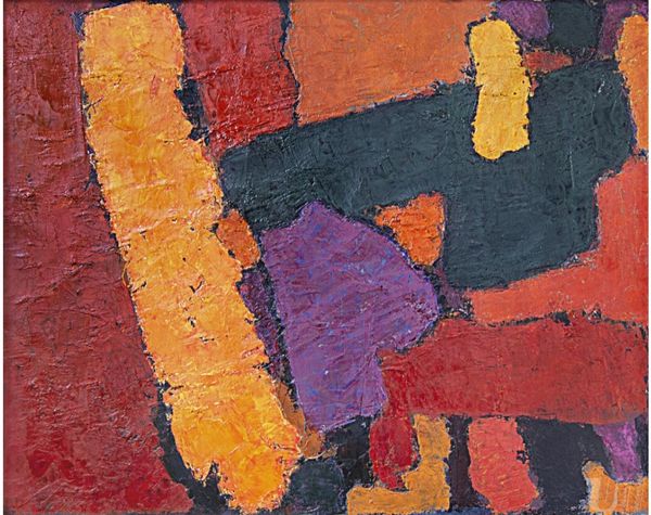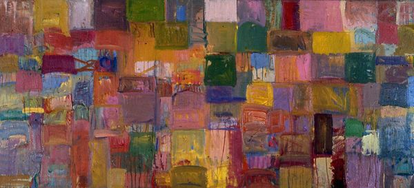 Editor: This is Hans Hofmann’s “Kaleidos” from 1958, an acrylic painting. The composition is essentially stacked rectangles and squares. I’m curious about the title because while “kaleidos” suggests fractured reflections, this feels more like an assertive construction. What do you make of it? Curator: It's fascinating how Hofmann uses geometric forms and color so boldly. Given your thoughts on the title, does this then remind you of a city plan perhaps, with the shapes suggesting buildings and roads? The colours evoke an emotive urban feel, wouldn't you agree? Editor: Yes, I can see the urban connection. The way the colors interact feels very Fauvist, creating a push-pull effect with depth and surface competing. There are those grounded, earthy hues right next to vibrant, almost jarring, colours. Curator: Absolutely! Now, think about this “push and pull” as Hofmann’s signature characteristic in Abstract Expressionism, as something deeply psychological: what could these visual dynamics reveal about post-war society, perhaps a sense of being pulled between tradition and the new? Editor: That’s interesting. Maybe the geometric forms represent a desire for order while the clashing colours express the anxieties and contradictions of the time. Curator: Precisely! Visual symbols evolve and carry new weight over time. So what started with colour can eventually convey a profound message regarding society. This definitely gives us a new perspective on what is otherwise considered abstract work. Editor: This reframing truly allows us to engage on a much more complex and compelling level. Curator: Indeed, there is so much more that symbolism has to offer when experiencing visual art and cultural artifacts.
