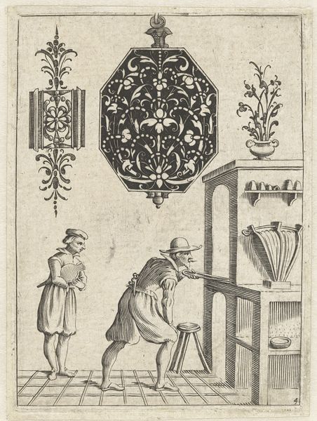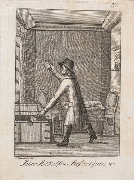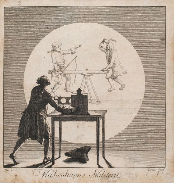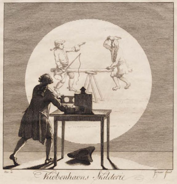 Editor: This etching from 1787, titled "Kjøbenhavns Skilderie" by J.F. Clemens, presents such an intriguing scene! It's monochromatic, focusing on a man using a boxlike camera obscura. What do you see in this piece that jumps out in terms of historical meaning or social commentary? Curator: This print functions as a fascinating visual argument about power and representation in late 18th-century Copenhagen. Consider the very act of depicting: who gets to represent whom, and with what authority? The camera obscura here could be seen as a tool of the Enlightenment, promising objective representation. Editor: Ah, I see! It’s like he’s capturing… history itself? The family tree with the crests really suggests lineage and legacy. Curator: Precisely! Note the figures reaching out—almost pleading—toward this genealogical tree displayed behind the camera obscura’s projected image. The nobility is literally being "captured." Are they attempting to claim control or influence of their historical narrative as it's depicted and recorded? The figures’ postures of supplication could tell us something about power dynamics in the era. Editor: That’s really insightful! So, is Clemens perhaps critiquing how history is being selectively recorded and controlled? Almost creating an archive in real time? Curator: Exactly! Think about who had access to these tools and knowledge at the time, and whose stories were deemed worthy of preservation. Does the print raise questions about historical accountability? Does it comment on issues like legacy and lineage being scrutinized in the public eye? The imagery suggests wealth being observed by, what seems to be, the artist himself, perhaps on behalf of common viewers. Editor: I hadn't considered that element of social class observing aristocracy! That’s shifted my perception of the whole scene. Curator: The camera becomes an instrument for reinforcing or questioning the status quo through visibility. That's something I take away from this image and its era.