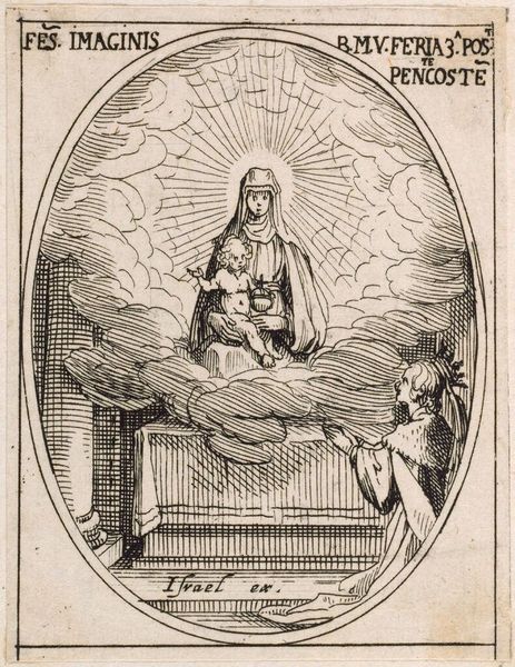 Curator: Jacques Callot created this tiny engraving, Saints Anania, Azaria, and Misael. It’s only about 7.6 by 4.9 cm, residing now at the Harvard Art Museums. Editor: It feels like a medieval dreamscape! The figures almost float within that dense, linear space. Curator: Callot was a master of etching. The fine lines create a sense of depth and drama, considering it's a print, and the social aspect of the printing press. It was very inexpensive to share these images at the time. Editor: It's amazing that from this small piece, a powerful story unfolds—a testament to faith, rendered with such delicate touch! Curator: Yes, seeing how Callot depicts these three saints defying the king—it reflects a specific moment in cultural belief through the labor and materiality of engraving. Editor: Thinking about it, it almost feels like a tiny stage, and we're witnessing a miracle happening. Curator: Exactly, the interplay between the material and the spiritual gives it its enduring power. Editor: A truly fascinating intersection of craft and vision.
