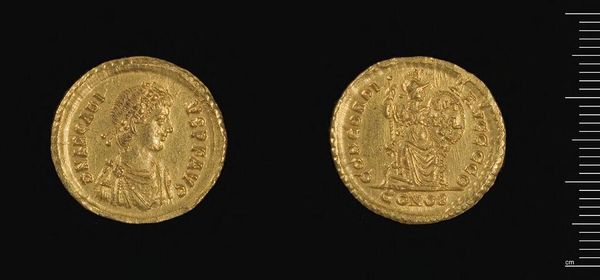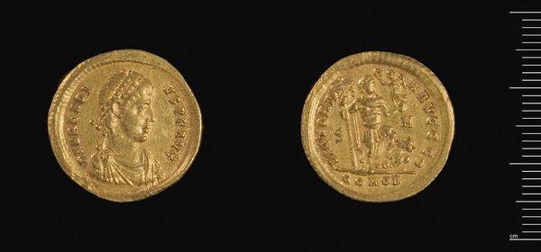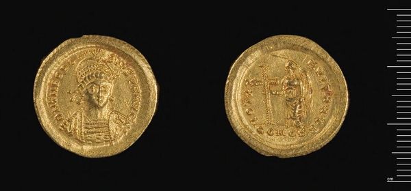 Curator: Look at this piece: a gold Solidus of Theodosius II, struck in Thessalonike. Its weight is a mere 4.49 grams. The figures seem remarkably solemn for something so small. Editor: The gold surface is highly reflective, almost obscuring the images. The coin seems to emphasize a direct lineage of power, likely reinforcing imperial authority through its imagery. Curator: Indeed. The depictions and inscriptions carry significant weight. The emperor is shown holding symbols of power, legitimizing his rule through divine mandate. Editor: But who decided what those symbols should be? And who was excluded in this representation of power? This coin tells as much about political realities as it does about religious belief. Curator: Consider the repetition of iconographic elements—the cross, the emperor’s crown—they're designed for recognition and reverence. These symbols served as immediate visual cues. Editor: Symbols that simultaneously enforced social hierarchies. The coin might feel distant to us now, but its effect on people's lives then would have been very real. Curator: It makes you wonder how something so small could carry such weight in its time. Editor: Power always finds a way to condense itself, doesn’t it?