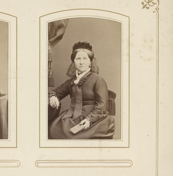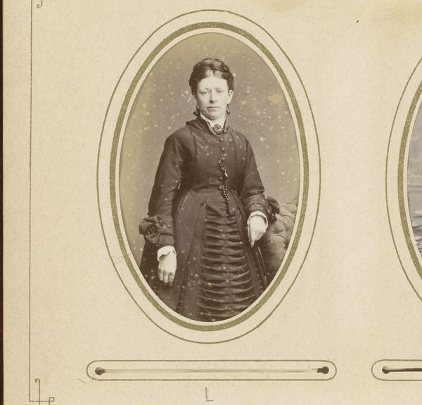 Curator: This striking albumen print, known as "Portret van een vrouw," is estimated to have been produced between 1859 and 1870. Editor: There's a captivating stillness to it, isn't there? The oval frame creates a sense of contained composure, while her direct gaze is quite arresting. It is also evocative, since there must have been substantial labor into producing a single print like that one! Curator: Indeed. What we see is heavily influenced by the rise of photography studios that democratized portraiture during the mid-19th century. Suddenly, posing for a painted portrait wasn’t solely for the wealthy. This made such photographic images become cultural artifacts. Editor: It also allowed middle-class consumer aspirations to soar to an unimaginable place. I’m interested in the technical elements here too. An albumen print uses egg whites to bind the photographic chemicals to the paper. This made it a dominant process, especially regarding the nuances created in tonal range. Curator: It's also interesting to note the symbolism. The chair she is leaning on looks ornamental. As photography emerged, the style choices—the clothing, the backdrop, and even this chair—were designed to convey respectability, a vital signifier in Victorian society. Editor: Looking at the dress, the lace trim suggests detail in materiality. And think of the social conditions and available tools when crafting the textiles, not to mention what women were allowed or forced to wear in such photographs. What kind of constraints and possibilities were available in that era? Curator: It highlights how photography both reflected and shaped the societal ideals and public personas of the era. These carefully curated images offer powerful clues, but the reality behind the constructed image must be significantly more diverse. Editor: It makes me appreciate how tangible photographs of the period really are. It makes one stop and think about how many people must have touched and looked at this piece. It's very moving to hold it for that reason.