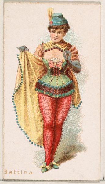 Curator: Before us is “Effie, from the Ballet Queens series (N182) issued by Wm. S. Kimball & Co.,” dating back to 1889. The artwork, now residing at the Metropolitan Museum of Art, employs drawing and colored pencil as primary mediums, manifesting as a print. Editor: Well, my first impression is... energetically theatrical! The boldness of the colors, particularly the vibrant reds and greens in the costume, grabs your attention immediately. Curator: Indeed. The piece echoes the stylistic contours of Ukiyo-e, which highlights fleeting moments and genre scenes, embedding this ballerina within a broader historical narrative of entertainment and cultural fascination. The somewhat exaggerated proportions lean towards caricature. What symbols resonate with you? Editor: The color choices feel significant. Red, of course, often represents passion and vitality, aligning with the energy of ballet. The green accents provide an interesting counterpoint. The geometry of the stripes and overall construction of her clothing feel constructed more for symbolic meaning than mere flattery. Curator: I agree. Red has deep symbolic connections, signifying life, blood, but also defiance and power. Her self-assured stance and the confident gaze—despite being a caricature—present a woman owning her space and performance. She is not a passive beauty, but an active participant in a cultural ritual. Do you pick up any specific themes, or connections to historical representations? Editor: The overall effect reminds me a bit of Art Nouveau with its playful approach to form. There’s a sense of idealized representation at work. Curator: Right. And while seemingly lighthearted, such pieces provide essential records of popular entertainment in the late 19th century, offering insights into social values, beauty standards, and the era’s fascination with performance and celebrity. Editor: It strikes me that while the colors and outfit are rather exaggerated, the woman's face is presented quite naturalistically. It adds a kind of groundedness to the whole composition, counterbalancing the more outlandish aspects. Curator: Exactly. It highlights the tension between artifice and reality inherent in performance itself. I’m glad we were able to spend time with it! Editor: It certainly was an eye-opener, quite vibrant for its time, indeed.