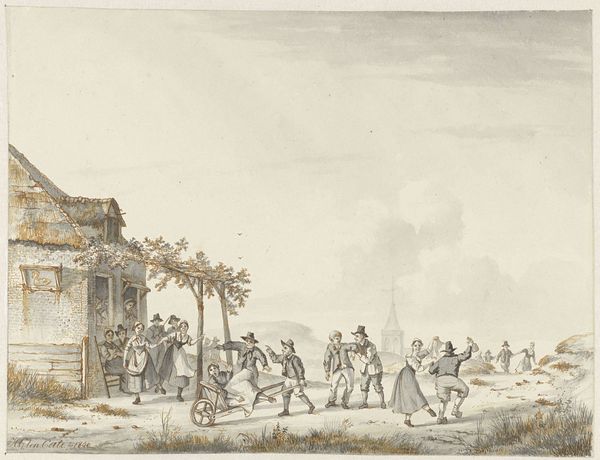Editor: This is "Winter Landscape with Ice Skaters" created in 1737 by Louis Chalon. It’s a watercolor and coloured pencil piece. The pale hues give it such a chilly, almost melancholy feeling. What symbols or stories do you see unfolding within this frozen scene? Curator: Beyond the obvious festive air, I see echoes of human connection across time, a desire to revel even amidst winter's severity. Consider the placement of figures. See how groups are clustered near structures, whereas individuals populate the open ice. How do the shapes formed by these groups suggest distinct aspects of community versus isolation, belonging versus independence? What about the figures themselves; their gestures, even rendered in watercolour, subtly narrate individual tales. Editor: I hadn't considered the groupings quite like that. It’s interesting how something that seems like a simple genre painting becomes so much richer when you start to see these details. What would the image's symbolic relationship to memory have been for those who viewed it contemporaneously? Curator: Remember that such scenes cemented ideals of community amidst shorter days and dwindling resources; symbolic assurances, perhaps, against anxieties spurred by the season’s darker elements. Each figure in motion, each detail in colour or shadow, became imbued with emotional, cultural weight; visually echoing shared human experiences across generations. Now that you’ve considered that, does your understanding of the image shift at all? Editor: It certainly does! What seemed a straightforward landscape now holds layered meanings – the chill isn’t just weather; it’s a canvas for understanding humanity's shared experience, resilience, and the warmth we seek within community. Thank you for shedding light on all those undercurrents! Curator: Indeed, and through images like these, the past speaks to us in surprising ways, revealing cultural continuity through visual echoes and cues that we can decipher, even today.