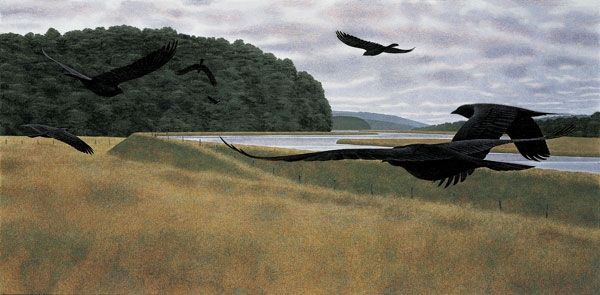 Editor: This is Hans Thoma's "Wondrous Birds," painted in 1892 using oil paints. The image feels simultaneously peaceful and a little unsettling to me. The birds are large, almost overwhelming against the landscape. How do you interpret this work? Curator: For me, "Wondrous Birds" sits at an interesting intersection of Romanticism and emerging ecological consciousness. Consider the date, 1892. While seemingly a tranquil scene, it was painted during a period of intense industrial growth and increasing environmental degradation. The birds, these 'wondrous' creatures, might be read as symbols of a threatened natural world. Editor: So, are you suggesting the painting carries a message about environmental issues? Curator: It’s not necessarily a direct protest, but it can be considered a commentary. Thoma and his contemporaries were becoming aware of humanity's impact on the natural world. What about the birds themselves strikes you? Do they seem idealized or realistic? Editor: They do seem majestic, but also vulnerable somehow, set against this wide open space. Curator: Exactly! Think about the power dynamics inherent in landscape painting. Often, the human gaze dominates the scene. But here, we are invited to consider the perspective of the birds, their freedom, and potentially, their precarity. It brings forth the tension between human progress and the preservation of the environment. Editor: That's a really interesting way to look at it. I initially saw it as a nice landscape, but now I see a more profound ecological subtext. Curator: These older works are like that – they have hidden layers, and prompt interesting new questions for the present day!