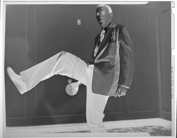 Curator: This curious photograph, titled "Untitled (two men sitting on inflatable toys)" is by Peter James Studio and resides in the Harvard Art Museums. It measures roughly 10 by 13 centimeters. Editor: My initial impression is pure theatricality. The high contrast and odd subject matter create a surreal, almost dreamlike quality. Are those…inflatable toys? Curator: Precisely. The negative image casts a bizarre light on accepted notions of masculinity, poking fun at social constructs. Editor: It's fascinating how the material—perhaps rubber or vinyl—of these toys is rendered here, almost alien. And the suits! A stark juxtaposition between formal attire and frivolous playthings. Curator: I wonder about the intended audience. Was this a private joke or meant for a wider public? The context of its creation feels key. Editor: Absolutely. And examining the labor behind the production of these inflatables could reveal a lot about consumer culture at the time. Curator: A compelling point about the photograph's place within a larger network of production and consumption. Editor: Well, this photo certainly offers more to explore than first meets the eye! Curator: Indeed. It is a reminder of the layered contexts that influence art’s reception.