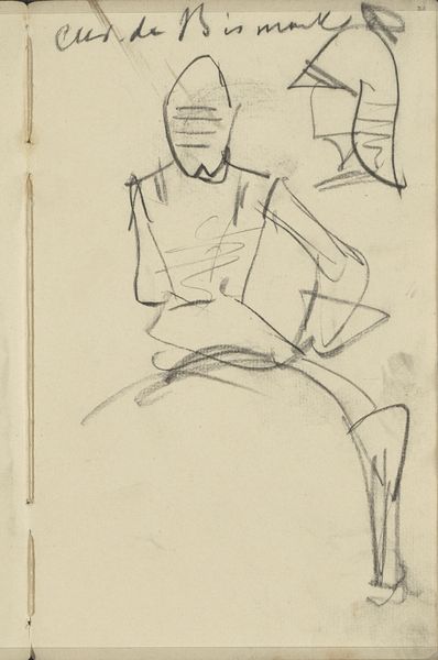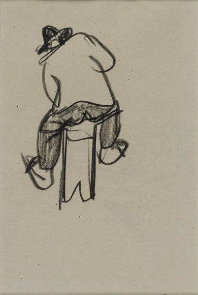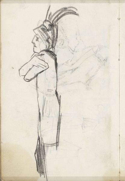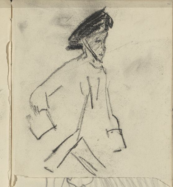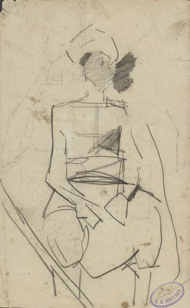 Curator: The artwork before us is a pencil drawing by George Hendrik Breitner, entitled "Jonge vrouw met een hand in haar zij," created sometime between 1886 and 1903. Editor: Immediately, I'm struck by the pose. The way she stands with her hand on her hip conveys a certain confidence, even defiance, despite being seen from behind. Curator: Indeed, the pose is deliberate. Consider the societal context of late 19th-century Amsterdam. Women were negotiating changing roles, challenging traditional expectations in both private and public spheres. This stance can be read as a quiet assertion of agency. Editor: The rapid strokes! Breitner captures her essence with minimal detail. I wonder about the symbolism behind presenting her from this particular vantage point, however; are we intentionally kept at bay? It's a fascinating composition. The unfinished shape above her, it reminds me of an eclipsed moon. Curator: I read it as an unfinished sketch of a hand or face, possibly representing further studies by Breitner. Breitner was, after all, deeply embedded in depicting everyday life of Amsterdam’s working class and would fill many sketchbooks. Also, keep in mind that while identified as Impressionist, he was not fully embraced by the Parisian school and developed his particular take, influenced by literary realism and an interest in capturing movement and emotion through observation. It aligns perfectly with his focus on candid moments. Editor: And yet there's an evocative ambiguity that the unfinished nature contributes. I notice how her dress hangs, like a sort of modern toga or ancient cloak. Is this also a modern rendering of some long held ideas? I find the tension between classical echoes and candid immediacy captivating, speaking to lasting questions of representation, what does a woman's presence _mean_ in society? Curator: The fluidity and quickness do invite multiple interpretations; there's a clear lack of adornment and luxury in the drawing's subject matter. She is present. But one wonders, from what strata? Who are these 'jonge vrouwen'? Breitner rarely included biographical information and even avoided his subjects when sketching them. The gaze in many ways, returns back at the observer with its implied and constructed questions. Editor: It's fascinating how such a simple sketch can unlock such a complex set of questions and associations. There are far more questions implied in these works, both explicit, and buried. I'm drawn to revisiting the way lines move and how shadow gives us information while retaining a careful guard. I think the artist wants us to do more looking! Curator: And so it is with the best works, they invite introspection into both self and culture. Thanks for the analysis!