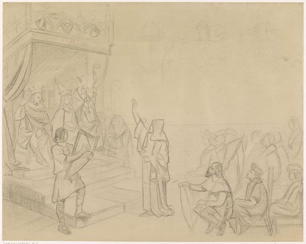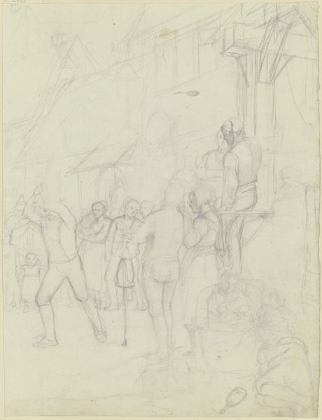 Anton Radl created this drawing, "Verlosung eines Hammels in der Umgebung von Frankfurt", with a graphite pencil. The composition is dominated by a crowd of figures tightly grouped, creating a sense of communal anticipation. Radl uses a delicate network of lines to construct the scene, with varying densities suggesting depth and texture. The architectural structure above the crowd is only vaguely visible, but the convergence of lines might indicate a canopy or a rudimentary roof that frames the social event. Note how Radl plays with the semiotic contrast between the clear, expressive gestures of the people, and the rough sketch. Radl is capturing a fleeting moment of rural life. The unfinished quality of the drawing invites viewers to consider the relationship between representation and reality. It is a reminder that art is not merely a mirror of the world, but an active construction of meaning.