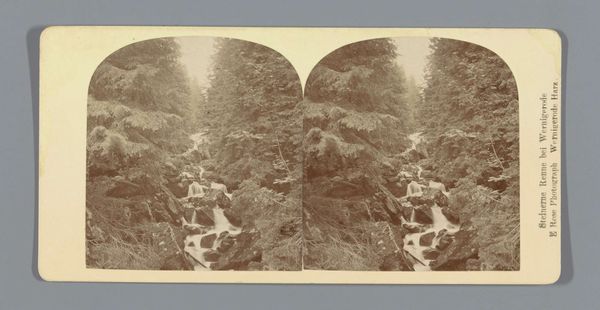 Curator: Immediately, I notice a subdued stillness in this photograph. It almost feels muted, even melancholic. What do you see? Editor: This is a gelatin-silver print of ‘Steinerne Renne nabij Wernigerode,’ taken by E. Rose sometime between 1855 and 1880. It’s a fascinating example of landscape photography in that period. Look at the double perspective; the mirrored duplication adds an immersive quality. Curator: Immersive, certainly. The doubled image does pull you in. There is something intrinsically powerful about waterfalls: they carry connotations of cleansing, the passage of time, the raw energy of nature itself. Editor: The tonality is quite remarkable. Consider how Rose manipulates light and shadow to sculpt the form of the waterfall. Notice how the vertical thrust of the falls is punctuated by the horizontal ledges, giving it a highly structured appearance. Curator: Precisely. That push and pull creates a tension. Is it intended as a microcosm for broader struggles, an echo of the philosophical preoccupations of Romanticism? It feels like an articulation of man dwarfed by nature’s grandeur. Editor: Or it’s about controlling chaos. Perhaps it's not so much dwarfed but attempting to create order with nature, trying to harness the energy through composition. Look how our view is directed to the falls, the use of light and shadow to create depth and guide our eye. Curator: A fair point. The photographic medium lends itself to that desire to document and control. It feels like an attempt to hold onto a fleeting moment in the ceaseless flux of nature, which may also suggest that controlling chaos and man’s futile ambition and ultimate insignificance may have always been intertwined concepts. Editor: I see Rose meticulously balancing natural form with the geometric frame of the image itself. It brings me to question our perceived sense of harmony between humanity and nature. Curator: This image presents a dichotomy which makes one ponder just how enduring such universal symbolism truly is across our collective consciousness. Editor: It has been a journey through light, form, and perspective.