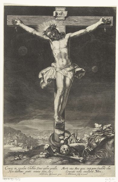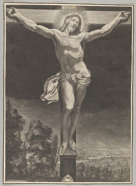 This print of the Crucifixion was made by Robert van Audenaerde, a Flemish artist active in the late 17th and early 18th centuries. It’s an engraving, meaning that the image was incised into a copper plate, inked, and then printed onto paper. Notice the extraordinary detail that Audenaerde was able to achieve through this laborious process, and the contrast between light and shadow. This tonal variation is created by making many tiny cuts into the metal. The overall effect is pictorial, almost like a photograph. But the means of production are crucial to understanding the image. Engraving was a highly skilled, time-consuming craft that required years of training. The resulting prints were luxury goods, circulated among a relatively small, elite audience. This connects with the wider social context: the cost of materials and labor involved in the production process. The image stands as a testament to the enduring power of skilled handwork. By focusing on the making of this print, we can appreciate the cultural values and artistic traditions that it embodies, challenging any strict divide between art and craft.