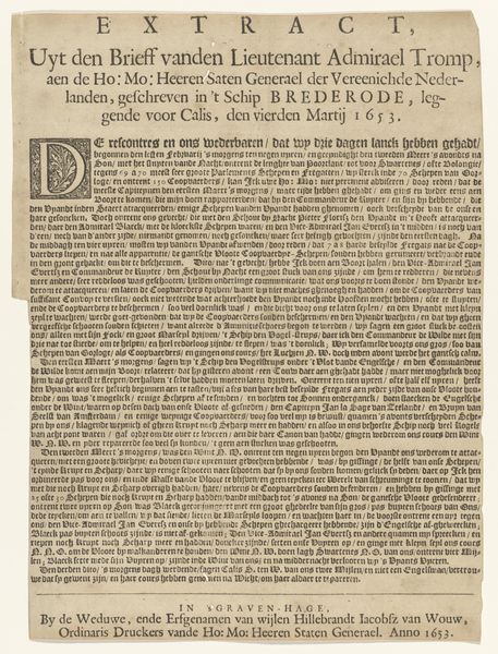 Curator: This object, dating possibly to 1653, is entitled "Extrakt uyt verscheyde Brieven Van 't Manhaftig Zee-gevecht, tusschen de Vloot van den Admiraal Johan van Galen, ter eender; Ende de Engelsche vloot, ter andre zijde." The Rijksmuseum attributes this print to an anonymous maker. Editor: What strikes me is how intensely detailed this piece is. The density of the old, compressed font creates an immediate impression of textual authority, an age-worn declaration. It feels like holding a piece of history. Curator: Absolutely, and that is largely what it is. The print documents a naval battle between the fleet of Admiral Johan van Galen and an English fleet near Livorno. You have got detailed accounts claiming to be extracted from letters sent from the fleet, detailing strategic decisions, casualties, and acts of bravery. It reflects Dutch maritime power in the 17th century. Editor: I notice specific details about ships and weaponry, but they become allegories in themselves. The "Brander," for instance – a ship deliberately set ablaze – serves as a potent symbol of aggression. It adds psychological and emotional intensity to the historical event being described. Curator: Indeed. The "Brander" ship can be viewed as an assertion of dominance, as well as the high stakes present in this battle, not just between the Dutch and English fleets, but it symbolizes a crucial moment in a larger conflict centered on trade routes and colonial power. There is mention of lost ships; one could say these casualties served as critical voices in shaping historical narratives about naval encounters, power and competition. Editor: And the mention of "Spaanse Bark," evokes broader colonial contexts and trading relations. The printing uses symbolic shorthand, activating complex, interwoven networks that informed this maritime world. These cultural reference points must have been highly relevant and deeply understood by its contemporary viewers. Curator: What is particularly compelling to me is the narrative construction of the historical narrative itself. How can these selected details, presented in a format resembling an official dispatch, influence public opinion and shape the memory of the battle? Editor: By choosing to foreground aspects such as sacrifice and strategic victory, it creates an emotive context. Looking at the aged paper now, there is more than just decay here – time has, ironically, solidified the original intentions of instilling a specific point of view. Curator: The power of information, then and now, as we find ourselves contemplating not just what is conveyed in those historical fonts but also its enduring implications. Editor: Precisely. A reminder that every artifact holds not just the echo of its past but a subtle hum in its ever-evolving interpretation, resonating even centuries later.