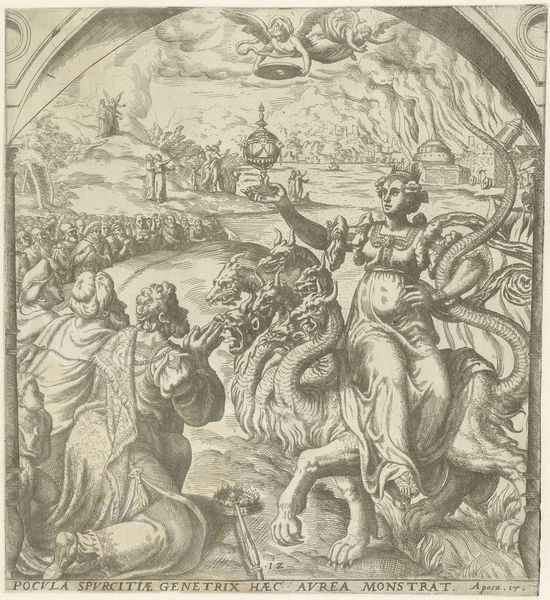 Curator: Welcome. Let's turn our attention to this print, "Allegory of the Twelve-Year Truce," created in 1609, currently held in the Rijksmuseum collection. It's a pen and ink engraving. Editor: It's densely packed, isn't it? At first glance, it feels like an official parade, with so much intricate detail crammed into a single scene. The material density is quite striking for a print; one can almost feel the weight of all these figures and objects. Curator: Absolutely. This work celebrates a very specific moment in Dutch history, the truce in the Eighty Years' War with Spain. What appears as a simple parade is actually rich with political symbolism and historical context, reflecting the burgeoning Dutch Republic's self-image. Editor: The way they've portrayed the city in the background—a prominent port! That, coupled with the presence of dignitaries, highlights trade as a crucial element and reminds us that these truces weren't just about peace, they were about resources, labor, and sustaining the economic infrastructure. Curator: Precisely. And consider how this print, likely disseminated widely, acted as propaganda. The artist showcases the benefits of peace but also reminds the Dutch populace of their hard-won freedoms and the importance of unity and continued vigilance. Editor: Look at the varying textures achieved solely with ink. There's a clear attention to surfaces, from the rough spun wheels on the wagons to what seems like velvet clothing on dignitaries. What does the layering and pen work tell us about the print-making workshops and materials available? Curator: That's a superb point. These mass-produced prints brought complex political narratives into homes and public spaces and fostered a sense of national identity through repeated viewings. It became a part of everyday material culture. Editor: It’s also interesting how the artist frames the rulers, as a craftsman of narrative; they controlled the process of production. This object reveals the economic interests that underscore social movements. Curator: Examining the allegory alongside other political prints and pamphlets from the era allows us to see how these images actively shaped public opinion. It also opens avenues for analyzing the distribution networks of this type of political visual and it is a real time capsule. Editor: It is fascinating how a seemingly simple medium like ink on paper can convey such a wealth of information about its era. Thanks, I see now!