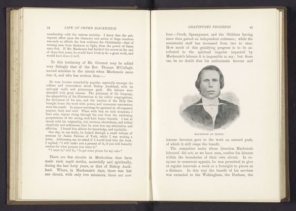 Curator: Here we have a photomechanical print, likely a gelatin silver print, before 1873, representing Samuel Davenport. It appears to be a reproduction within a book. Editor: There’s a profound stillness in this image; it’s immediately captivating in its formal composure, the tones quite subtle despite the clarity of the photographic medium. Curator: Absolutely, and I would draw your attention to the formal elements at play here. Notice how the linear qualities of the text on the facing page juxtapose against the figure’s softly blurred edges? The stark contrast draws our eye. Editor: It creates an intriguing dialogue between text and image. I am drawn to Davenport’s stern gaze, which, when contextualized in the frame of an open book, elevates it to an almost allegorical character. Curator: Precisely! The book acts as a stage for Davenport, who then becomes an icon or archetype representative of early Plymouth society. What statements could we draw about that social environment, from its inclusion in this medium? Editor: This inclusion presents cultural values, sobriety, and enterprise as qualities worthy of emulation. In that sense, the symbolic value here underscores his legacy; even now we are talking about him! His likeness exists independent of the original text on the opposite page, too. Curator: Good point. By framing it within the book, the photograph not only serves a biographical purpose but also embodies an era’s ideals and aspirations. The printing and presentation is certainly functional; by creating this volume, each likeness serves a new social purpose for future viewers. Editor: It's a fascinating snapshot, capturing not just a person but a set of beliefs and their endurance through time. Curator: Agreed, considering the overall composition in these stark formal terms, this artwork reveals multiple conceptual layers beneath a seemingly straightforward presentation. Editor: For me, exploring the visual echoes in historical likenesses—Davenport as a lasting figure of aspiration—is a thought-provoking glimpse into collective memory and cultural continuity.