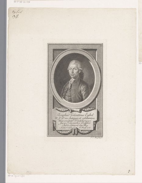 Editor: This is "Portret van Franz Rudolph von Grossing," a print, likely an engraving, from between 1764 and 1804 by Peter Haas. It’s quite formal. What really strikes me is the way he’s framed, almost like a cameo. What do you see in this piece? Curator: The oval frame itself speaks volumes. The oval, you see, represents containment, a controlled world. But within, there’s Franz Rudolph. Notice how the gaze confronts us. It asks a question. The very font, a formal script, also reflects authority, permanence. It imprints identity onto the viewer’s memory. Editor: So it's not just about likeness, but about projecting an image. Is there something symbolic in the text below the portrait? Curator: Absolutely! The text, "Franciscus Rudolphus a Grossing," along with "M. Theresinae quondam Imperatrici," and the birthdate, anchors the sitter in time, connecting him to Maria Theresa. What do these details say about how he wished to be remembered? Editor: That he was somebody important! Linked to the Empress, to history itself! Curator: Precisely! Think of heraldry, the symbols used to convey lineage. This portrait uses typography and framing in a similar way. It's visual branding. And remember, Baroque loved grandeur, but also emotional intensity, think of Bernini's sculptures. How does the sitter project strength and status in the composition? Editor: The way he fills the frame. It's carefully calculated, that's for sure. Curator: Indeed! Each element reinforces a narrative of power and pedigree. What began as a simple portrait suddenly reveals layers of meaning beneath the surface! Editor: It definitely makes you consider how every element in a portrait, down to the font used, conveys information and shapes our perception of the subject. Thank you!