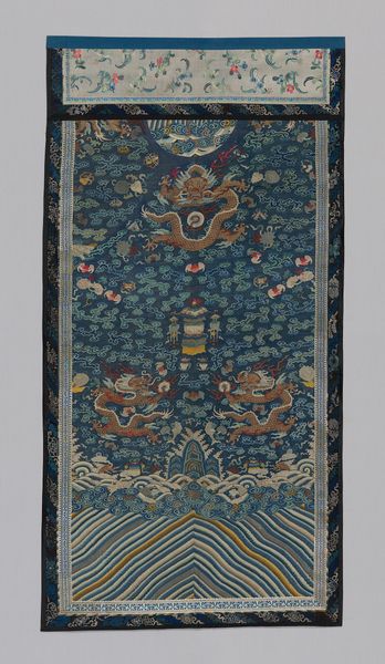 The Tibetan priesthood extensively used imported silks from China to decorate their monasteries. Temple interiors were exceptionally colorful with their silk canopies, banners, and altar frontals. This banner is typical of those that were suspended from pillars or hung from roof brackets in image rooms and lecture halls. The lower section, made from several different types of silk fragments, has such auspicious Chinese motifs as dragons, clouds, bats, and lotus flowers. Like most Tibetan banners, however, the top is dominated by a large stylized lion mask in silk appliqué. This angry manifestation protects both Buddhist doctrine and the temple where it was displayed. The mask, in turn, is topped by a circular mirror, the standard reminder that the reality we see is an illusion.