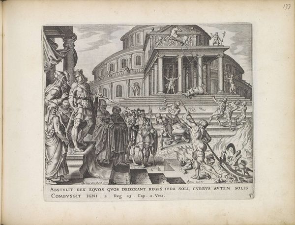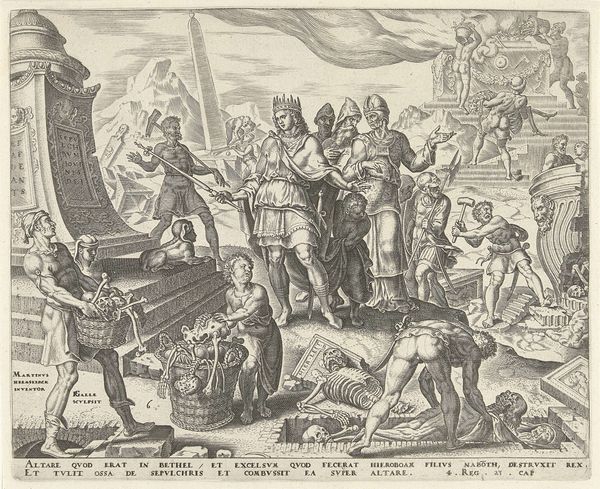 Curator: This intricate engraving is entitled "Koning Josia laat de offerplaats in Betel ontheiligen," dating back to 1643. It's currently housed at the Rijksmuseum. Anonymous, or currently unknown, but steeped in the conventions of its era. Editor: My goodness, there's a lot happening in there! It feels… intense. Dark, dramatic. A visual feast—if you're into dramatic destruction. There's so much to unravel here. Curator: Indeed. This work encapsulates the story of King Josiah defiling the altar at Bethel. Iconographically, we see figures enacting destruction—demolishing idols, disinterring bones. The whole piece feels like a purification ritual made visible. Note the careful attention to detail in the clothing. The body language indicates their engagement and activity in the event. The pyramid, column, mountain, people on the stairs. The space between these forms is so great they do not relate visually, making each group more segmented and isolated. Editor: So, destruction as a form of renewal, yes? It does play almost like a theatrical production with Josiah taking center stage in the process of erasing previous symbols. He becomes the symbol for something new, whatever "new" means to him. Do you find it ironic how something has to be made into something, and thus be unmade once the novelty is over, just so something can be made out of something. The cycle starts again! Curator: Cycles of destruction and renewal are pervasive in art. In a more limited sense of this picture and subject. Consider this piece not just as an act of iconoclasm, but also the reassertion of religious and political power. Notice how the architecture on the left stands to imply past forms that should remain dead, while at the right they engage in active, yet futile, demolishing activity. The baroque dynamism amplifies that power by highlighting Josiah's agency in that power display. Editor: Power plays; visual theatrics—it's all there. I find the casual desecration of human remains jarring in the work— the skeletal remains really put emphasis on what this ritual means. They are literally disrupting lives of the people from the past. So much to consider on our time, their space, where we are going and where we’ve come from. Curator: A potent reminder, then, of how the symbols we create and destroy shape our world. A good conversation for us to step away and think over. Editor: A thought-provoking dive, for sure! Thank you!