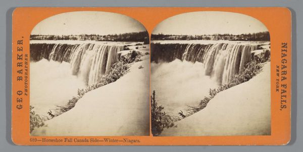 Editor: This is a stereo photograph of the American Falls, taken by George E. Curtis sometime between 1866 and 1910. The twin images give it a cool 3D effect, and you really get a sense of the immense power and scale of the falls. What strikes me most is how the image almost fetishizes this natural wonder. How do you read this image? Curator: This photograph, seen through a materialist lens, reveals the commodification of nature itself. We're looking at a mass-produced image designed for consumption, packaging the sublime experience of Niagara for easy distribution. Note the photographer, Curtis, becoming a conduit, facilitating the access to this landscape. What’s interesting is how photography itself, a relatively new technology at the time, aided this process, transforming the falls from a physical entity into a reproducible spectacle. Editor: So you're saying it’s not just about the beauty of the falls, but about making it available to everyone as a sort of possession? Curator: Precisely. And consider the labor involved in the image's creation: from the extraction of materials for the photographic process, to the physical act of taking and developing the photograph, and then the distribution. It's a chain of production, each step embedded with its own social context. The falls become secondary, almost a raw material itself. It makes you wonder what the environmental impact of that whole production process would be. What do you make of that? Editor: That’s fascinating! I hadn't considered the environmental cost and labor involved in creating an image like this. Thinking about it as a product changes everything. Curator: Indeed. It forces us to examine the complex relationship between nature, technology, and capitalism. The production is not merely artistic, it's an encapsulation of material history. Editor: Thanks, this really offers a new way to interpret such landscape photographs.