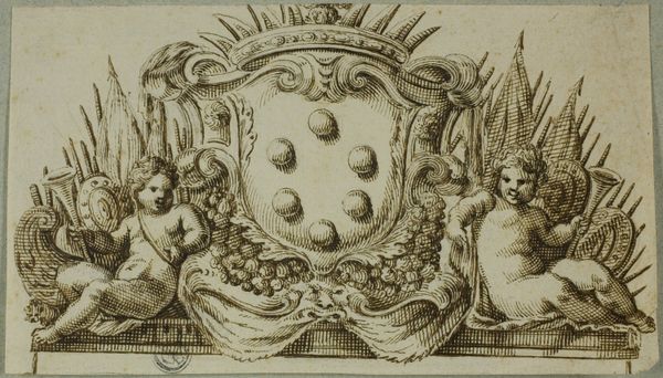 This unmarked etching at the Rijksmuseum presents a symmetrical frieze with playful details. Two reclining putti anchor the composition, their forms mirroring each other across a central medallion. The anonymous artist uses line and texture to create depth within this monochrome work. The garland, tied with ribbons, is a dominant feature, its weight balanced by the figures beneath. Each putto is paired with an object-- dividers and a set square-- perhaps alluding to measurement and construction. The central medallion with a star and crescent introduces an element of symbolic meaning. While seemingly decorative, the frieze subtly destabilizes simple aesthetic categorization. Is it purely ornamental, or does the inclusion of the putti with their respective objects suggest deeper intellectual themes related to craft and knowledge? It is through this interplay of form and content that the print invites us to consider the cultural codes embedded within its design.