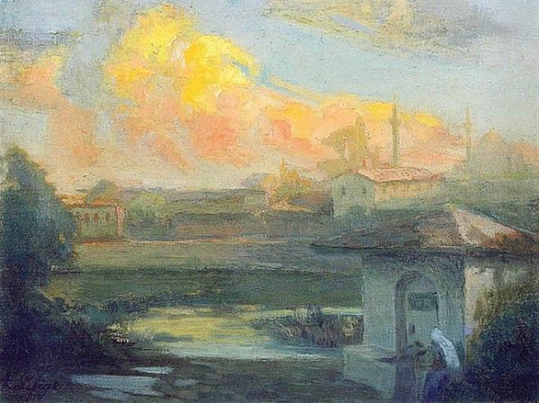 Albert Gottschalk made this painting, Porta Furba, Rom, with oil on canvas. It’s a landscape with an architectural feature. You can see he’s using layers of browns, reds, blues, and greens. It's interesting how he models form through colour and light. The paint is applied in thin, transparent layers. There's a sense of immediacy, like he's trying to capture a fleeting moment. Look at the archway, the way the light filters through it, creating a sense of depth and atmosphere. Notice how the archway is slightly off-center, which creates tension in the composition. And how he uses the same shade of blue from the sky in the centre of the composition. It reminds me a bit of Corot, with its soft light and muted colors. Like Corot, Gottschalk is interested in capturing the mood of a place, rather than just depicting it realistically. Ultimately, it’s a painting that embraces ambiguity, leaving room for multiple interpretations.