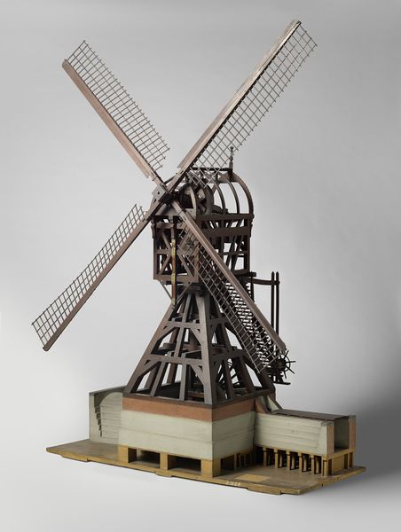 Editor: Here we have a spice container shaped like a windmill, likely from the 20th century, crafted in silver. It's incredibly detailed and feels like a miniature world. What stories or ideas do you think this little sculpture holds? Curator: This diminutive windmill is a fascinating vessel—more than just a container for spices, it holds symbolic power related to place and heritage. Consider the cultural memory it invokes; the windmill, particularly within the Dutch tradition, signifies ingenuity, resourcefulness, and triumph over the elements. It becomes a symbol of identity. Do you notice anything about the figures at the base? Editor: Yes, there appear to be small human figures near the base. It gives a sense of scale, showing how these windmills serve the community, perhaps grinding grain. Curator: Exactly. They subtly suggest the interconnectedness of community, labor, and the natural world, rendered in this precious metal. This wasn't merely a utilitarian object, it was also something displayed, a reminder of cultural pride and connection to place. It speaks to how identity can be solidified through cherished objects. Think of the windmill, always turning – representing resilience. How does that continuous motion resonate today? Editor: I hadn’t thought about it as an expression of cultural identity! Now I'm thinking about what objects today might hold a similar kind of symbolic weight and how future generations will interpret them. Curator: Precisely. Its value lies not just in the craftsmanship or materials but in its encapsulation of cultural meaning, continuously shaping how we see ourselves and our heritage. Editor: Seeing it as a vessel for both spices and cultural identity really changes my perspective. Thanks for making me think about the stories behind the symbols.