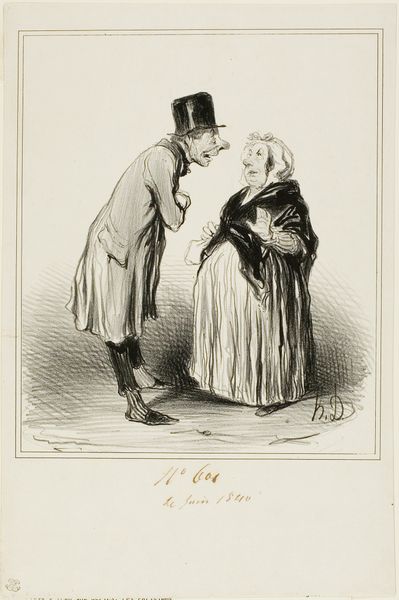 This lithograph by Honoré Daumier captures a moment thick with social tension and distorted power. The dominant symbol here is the act of coerced homage – the demand for a kiss, laden with implications of dominance and subjugation. This motif echoes through art history, recurring in depictions of feudal lords demanding fealty or religious figures expecting veneration. Consider, for example, how similar gestures of submission appear in medieval religious art, where kneeling before a deity signifies devotion. Here, however, Daumier twists it, exposing the darker, more carnal undercurrents of power dynamics. The forced kiss, therefore, becomes a charged symbol. It suggests a psychological landscape where power is asserted through the violation of personal space. It is not just about the kiss itself, but the humiliation, and the disquieting resonance it holds within our collective memory of historical power imbalances.