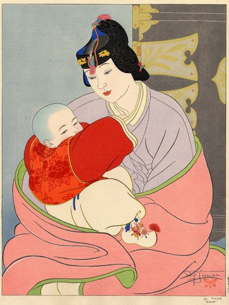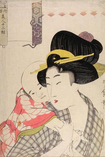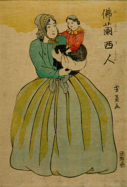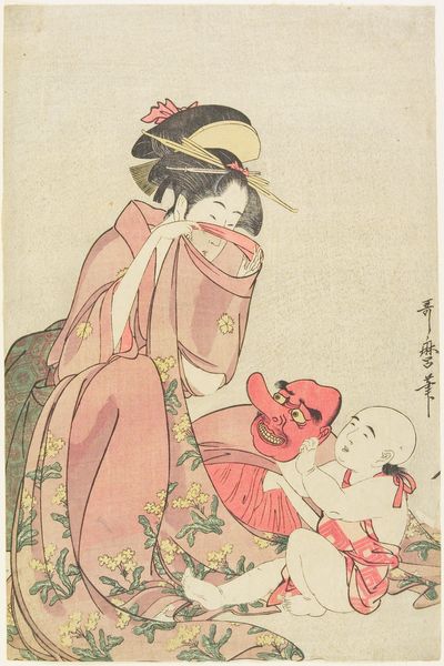 Curator: My immediate reaction is tenderness. There’s such an evident softness radiating from this image. Editor: Indeed. What we're observing is a woodblock print likely crafted by Tsukioka Yoshitoshi. It is known as 'Cherishing'. We see a woman cradling a baby. Woodblock printing was, of course, a crucial element of the Ukiyo-e movement and portraiture was very common, depicting fashionable courtesans or prominent Kabuki actors. But this feels very intimate. Curator: Absolutely. This is not the idealized beauty we see celebrated. Instead, there is a candid depiction of maternal love and vulnerability. Look at how the textile that wraps around them both features this repetitive water lily or chrysanthemum-like flower – repeated symbolic protection perhaps, resonating deeply with enduring human needs for protection and nurture. What does the historical context tell you about its reception? Editor: Prints like these became affordable, allowing a wider audience access to artistic works, thereby influencing popular perceptions of beauty, motherhood and family. We are not just looking at art, but how artistic images are woven into the fabric of social consciousness, shaping societal norms and values over time. Consider the evolution of images depicting women in public life, and how the narrative shifts with political changes. Curator: It is beautiful how you can sense a story, even if you do not know the precise origins. And there are complex emotional depths contained within what appear to be simple lines and flat blocks of color. Yoshitoshi has skillfully used the Ukiyo-e tradition to evoke a much deeper meditation. How does the role of art, particularly printmaking, intersect with broader sociopolitical forces, like evolving family structure or role of women at the time? Editor: Precisely, especially regarding distribution and the commodification of imagery. One might discuss gender dynamics and challenge assumptions about artistic canons by highlighting how the image operates within systems of cultural production, thus changing the way how art influences behavior in certain ways. These kinds of pictures really helped create the modern consciousness as well, of mother and family. Curator: An amazing point of consideration for an art form often deemed decorative. Editor: Indeed! An excellent point, and always something to reflect on.