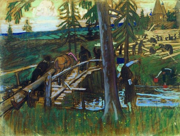 Editor: J.E.H. MacDonald's "The Beaver Dam," painted in 1919 using oil paints en plein air, has such an enigmatic feel, almost like a forgotten corner of the world. There’s a sense of stillness despite the visible brushstrokes. What sort of symbolism do you see present in the scene? Curator: Notice how the beaver dam, itself a symbol of industriousness and transformation, dominates the foreground. The red canoe nestled within it – does it suggest a co-existence, a harmonious relationship between humanity and nature or something else? The colour Red also may speak of strength. The beaver's creation becomes the resting place for human creation, maybe inviting us to think about our own intervention within the wilderness, eh? Editor: So the dam becomes more than just a structure, but a meeting point? What about the forest itself; does its symbolism add to this reading? Curator: Absolutely! Forests often symbolize the unconscious, the unknown. Notice the density, the way the trees seem to guard the scene, casting a psychological shade onto the work? This sense of an enclosed space hints that the journey of discovery and perhaps the symbolic representation of an inward psychological investigation or, quite simply, of one who knows intimately these spaces in the wild. How do these elements coalesce for you? Editor: That is amazing to consider, weaving industry and the individual together. Now the thick texture speaks to MacDonald's understanding of a particular space, almost making it tactile and relatable. Curator: Precisely, by examining MacDonald's symbolic imagery and understanding of iconography and personal narrative, and his relation with that personal experience within these locations in nature, perhaps it opens the pathway towards one's self. Thank you, the beaver works so that we all could enjoy the canoe safely ashore.
