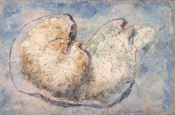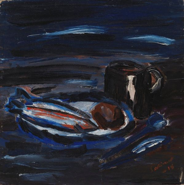 Editor: This is "Mackerel on a Plate" by William Scott. The simple composition of the fish against that stark background really draws me in. What do you see in this piece? Curator: The composition demonstrates a reduction to essential forms. The interplay of light and shadow is crucial. Note how the artist uses a limited palette to emphasize shape and texture. Editor: So, the dark background isn't just background, but a way to highlight form? Curator: Precisely. Consider also the materiality: the visible brushstrokes, the layering of paint. How does that contribute to your understanding? Editor: I guess it emphasizes the physical act of painting, not just representation. Thanks, that's really helpful. Curator: Indeed. It underscores the constructed nature of the image itself.