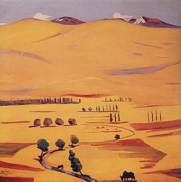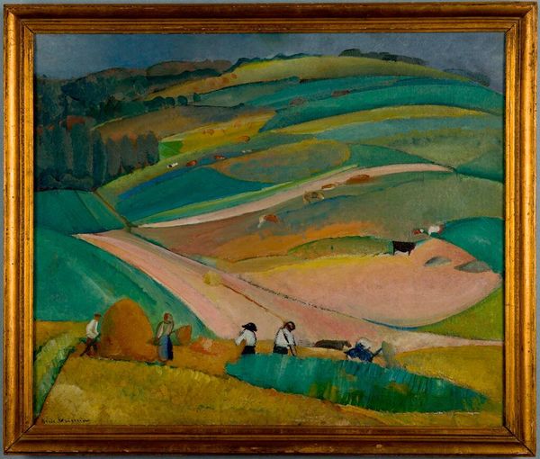 Editor: This is Émile Bernard’s "Harvest by the Sea," painted in 1891. It's oil on canvas and shows field workers on the coast. The stylized figures and somewhat muted palette give it a rather solemn feel, but there is an interesting compositional balance that evokes decorative harmony. How do you interpret this work formally? Curator: Immediately, the flattening of space strikes me, as does Bernard’s intentional distortion of forms, most noticeably the haystacks. The absence of a clear horizon line disrupts traditional perspective, creating a very surface-oriented composition. It's as if each shape—figure, haystack, coastline—is equally weighted in the overall design. Editor: It does seem to defy the conventional approach to landscape painting. What about his brushwork? Curator: Observe how Bernard applies the paint in broad, relatively uniform strokes, minimizing texture and detail. This flatness contributes to a sense of abstraction. It also pulls the viewer’s focus towards color relationships, specifically the muted tones of the field against the cool hues of the water and sky. Editor: I see what you mean. It’s less about representing the scene realistically and more about how the elements interact on a formal level. Curator: Precisely. Notice also the stark delineation of forms: hard outlines contain swatches of mostly unmodulated colours. Editor: Almost like cloisonné! It’s less of a scene and more of an intricate tapestry of shapes and colors working together. Thanks, seeing the painting through this lens helps me understand Bernard's unique artistic language. Curator: My pleasure. Paying attention to composition helps one decode visual organization, allowing the artwork to communicate on its own terms.