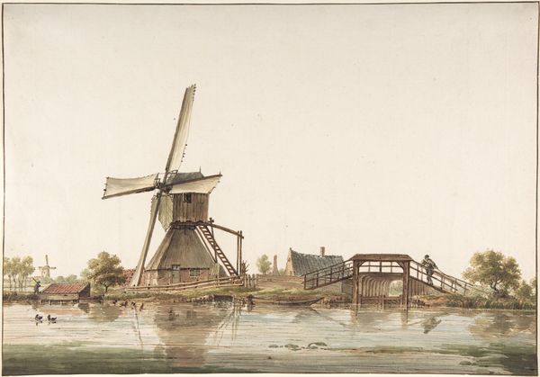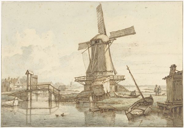 Arnoldus Johannes Eymer created this delicate pen and watercolor drawing of a windmill on a city rampart. Eymer lived through a time of significant social and political upheaval in the Netherlands. After the Napoleonic era, the country was trying to redefine its national identity while dealing with economic difficulties and class divisions. During this period, windmills were not just functional structures but also powerful symbols of Dutch heritage, ingenuity, and independence. The artist's choice to depict a windmill therefore situates the artwork within a broader narrative of national pride. Note how the mill towers over the small houses, becoming a central figure that dominates the scene. It is a silent witness of Dutch resilience. Eymer invites us to consider the relationship between the land, its people, and the structures they build. How can art both preserve and challenge our understanding of identity and belonging?