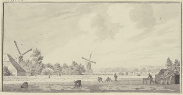 Curator: Welcome. Here we have Henri-Joseph Harpignies' "Landscape with Mill Along a Sandy Path", likely created between 1850 and 1855. It's an etching, a type of print. Editor: My initial impression is one of quiet stillness. The tones are muted, the scene seems almost frozen in time. It definitely evokes a sense of rustic charm, but a melancholy charm. Curator: I'd say that's consistent with romanticism. While influenced by realism's focus on everyday scenes, it also leans heavily into evoking particular feelings towards nature and labor, but with more class conciousness and observation. There's something powerful in showing the humanity inherent to ordinary life, moving against aristocratic narratives, right? Editor: Indeed, it certainly seems steeped in symbolism, with that prominent windmill. What do you see there, other than a building to grind grain? Curator: The windmill is multifaceted, in how it is and isn't still relevant, even at that point in time. Is it meant to be the idyllic countryside—the symbol of providing and a simple, almost humble life? Editor: It’s almost biblical, how this is contrasted with people who still occupy an idyllic space. But consider how its image can reflect notions of progress or, in a Foucauldian sense, a shift in societal structures... almost as if there are different people here being juxtaposed based on which time or type of social paradigm that they exist under. Curator: The composition really drives that tension home; placing the mill, seemingly disused and slightly overgrown, on one side, with the small family or farming group, just across. How the winding sandy path doesn’t simply bring both halves together. I guess that means the symbol doesn’t easily carry that. The weight falls over a potential shift. It's about more than rural life itself, right? Editor: Precisely. The path could symbolize life's journey or, even more broadly, the impact of technological advances on these people. It invites contemplation. Curator: Thank you. Editor: Indeed, a lovely piece offering some layers to digest, even today.