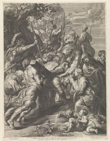Curator: Welcome. Today we’re examining a piece called "Manhood" attributed to Claude Gillot, created sometime between 1673 and 1722. It's currently held at the Metropolitan Museum of Art. What are your initial thoughts? Editor: Visually, it's quite arresting. The composition is dynamic, almost chaotic, with figures scrambling all over each other around a central reclining nude. The stark contrast and dense lines create a somewhat anxious mood. Curator: Indeed. It’s an engraving, a medium deeply connected to print culture and dissemination of ideas. Look at how Gillot uses line to suggest volume and texture. It reflects a societal interest in distributing allegorical representations and, therefore, constructing very public ideals. Editor: The engraving technique itself is fascinating. Note the density and varying weights of lines. He used it as a way of constructing something both detailed and evocative in the service of depicting an allegory. I notice, at the bottom, the writing of poetry, and believe that these textual features offer vital cultural contexts to analyze. Curator: Absolutely. The poem refers to the 'bitter times of pain and worry,' and the ability to use one's strength and avoid temptation. It emphasizes the social necessity for ‘manhood’ through work and delayed gratification— a stark contrast to mere hedonism or aristocratic privilege. Editor: The visual metaphor of figures struggling around this central female nude is also worth examining. They seem trapped or entangled in this process, and each worker has their respective labor as they work to maneuver an impossibly long log above the central figures. Curator: It's intriguing how Gillot presents this allegory. It appears that laboring is constructed as the path to virtue in this case. This virtue seems to reside ultimately in some measure of power over oneself and others. I read this visual strategy as symptomatic of an economy becoming capitalized with access concentrated into fewer and fewer hands. Editor: I can see that connection. Overall, it’s the tension between the dynamism of its components and allegorical structure that continues to hold my gaze. The Baroque dynamism is balanced by something very didactic. Curator: And that balance, or the negotiation within that imbalance, perhaps tells us a lot about the changing social and economic landscapes of Gillot’s time. Editor: A fruitful interpretation. This intense print rewards close, sustained looking. It truly brings the socio-economic environment into focus!