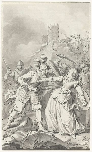 Editor: Jacobus Buys created this dramatic drawing, “The Princess of Espinoy Wounded During the Defence of Tournai, 1581,” sometime between 1783 and 1785. I'm struck by how much movement he captures with simple ink and pencil lines. What details stand out to you, especially considering the historical context? Curator: The immediacy of the moment is quite palpable, isn't it? Consider how the artist renders the Princess. She's not simply a noble figure; she's actively engaged, a shield raised in defense. This image taps into a deep cultural memory of female heroism, echoing figures like Joan of Arc. But let’s look closer. What does the presence of the city in the background, under siege, tell us? Editor: It definitely sets the scene. The turmoil seems to reflect a larger struggle, not just personal combat. So, the symbols aren't just about her bravery, but also about the resilience of the city, maybe? Curator: Precisely. Buys is consciously constructing a visual narrative layered with meaning. Note the contrast between the fallen soldier in the foreground and the stoic defenders behind the Princess. How might that play into the overall symbolic weight of the piece? Editor: Maybe it highlights the cost of war, emphasizing sacrifice alongside the Princess's valor. It's a stark reminder that even in victory, there’s loss. Curator: Indeed. Buys seems keen to underscore that war, though glorified, carries immense human suffering. The image of the wounded Princess is not just about celebrating heroism but is a meditation on endurance, courage, and the heavy burden of leadership. What's your takeaway from understanding these interwoven symbols? Editor: It's much more than just a historical record. It’s about the cultural values assigned to courage and sacrifice in a time of conflict, values that are constantly re-evaluated. Curator: Exactly. Art like this becomes a vessel for conveying and preserving societal values, doesn't it? Food for thought, definitely.