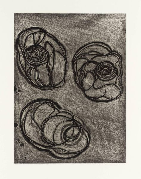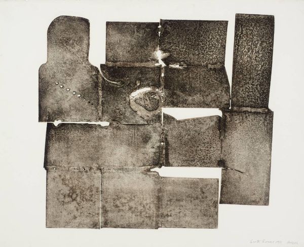 Editor: Here we have Victor Pasmore’s "Points of Contact No. 12," from the Tate Collection. I find the stark contrast between the geometric shapes and the organic forms really striking. What do you make of it? Curator: I'm drawn to the lithographic process itself. Consider the labour involved in creating these forms. The artist carefully layering ink, pressing paper, repeating these actions. Look at the deliberate mark-making; it’s not just about the image, but about the physical act of production. Editor: That’s interesting, I hadn’t considered the printing process so much. So, you're saying the value lies in understanding the method? Curator: Precisely! Thinking about the materials and the means of production allows us to challenge traditional notions of artistic skill and intention. Editor: That perspective gives me a lot to consider; it really emphasizes the physical aspect of artmaking. Curator: Indeed! It changes how we value the piece overall.