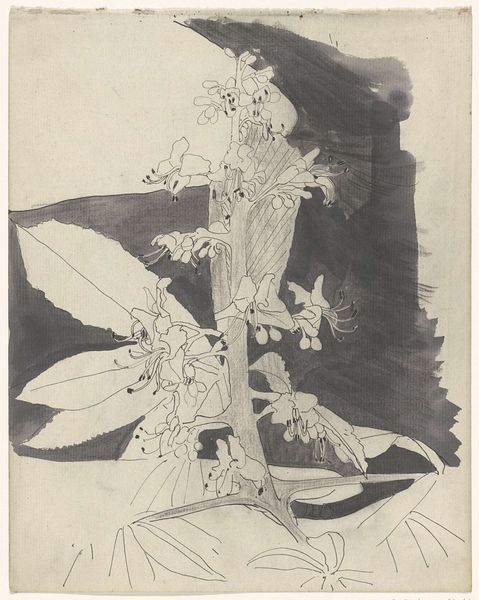 Editor: This is Aubrey Beardsley's "John Bull, Contents Page, 'The Savoy.'" The black and white ink drawing feels very extravagant and theatrical. What strikes you most about its composition? Curator: The dynamism and tension. Observe the subject’s precarious balance, emphasized by the elaborate yet somewhat unstable floral garland. How does Beardsley achieve this visual energy through line and form? Editor: The sharp, contrasting lines certainly create a sense of movement. The figure seems almost suspended, doesn't it? Curator: Precisely. The stark contrast contributes to the overall aesthetic, wouldn't you agree? It’s a fascinating study in contrasts. Editor: I see that now, thank you! It highlights the figure's bold presence, making him difficult to ignore. Curator: Indeed, and that’s what makes this piece so engaging.