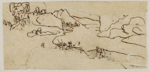 Curator: Looking at Rodolphe Bresdin’s pen and brown ink drawing, “People in a Landscape (Old Testament Subject),” it's striking how he renders such a vast scene on a surface just a few inches across. Editor: It feels almost frantic, doesn't it? The line work is so raw and immediate; you can almost feel the artist's hand moving across the page. Curator: Precisely. Bresdin worked largely outside of the established art system, often struggling financially. The urgency in his drawings might reflect the material conditions of his practice. Editor: And how does the "Old Testament Subject" play into this? Is it about the representation of power, community, or something else entirely within that historical context? Curator: Given Bresdin’s radical politics, it perhaps offers a commentary on societal structures, the hardships and hopes of collective existence. Editor: I hadn't considered that. Seeing the labor involved in the drawing itself shifts how I perceive the labor depicted within the scene. It definitely adds another layer. Curator: Indeed, considering the artist's methods provides a valuable entry point. Editor: I’ll certainly be thinking about the connection between creation and context now.