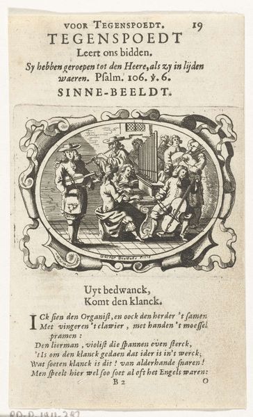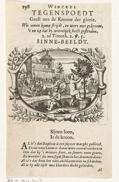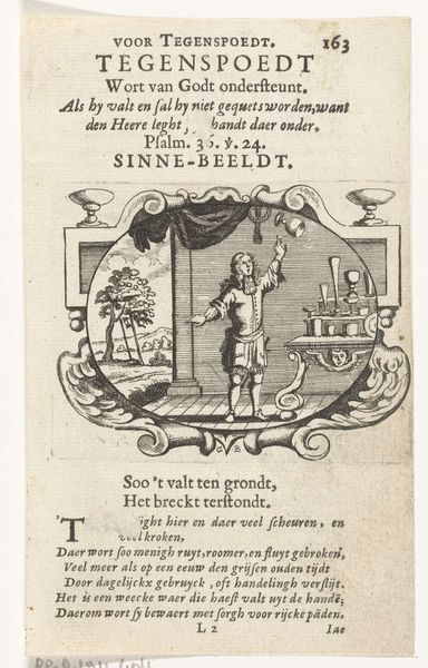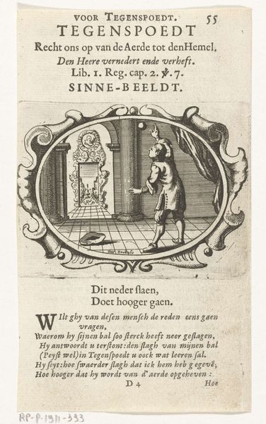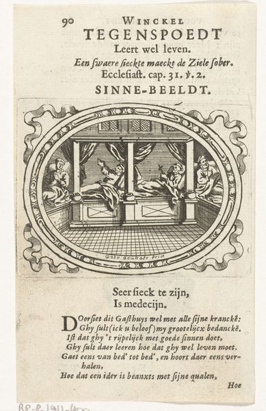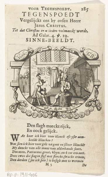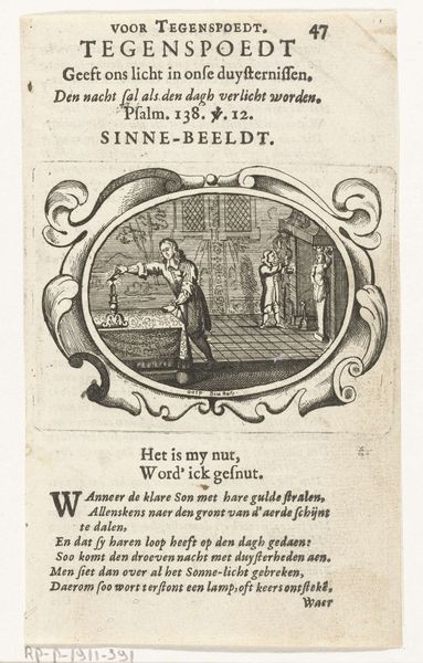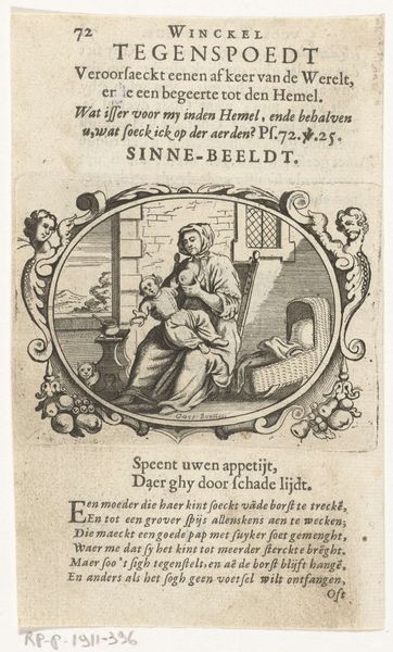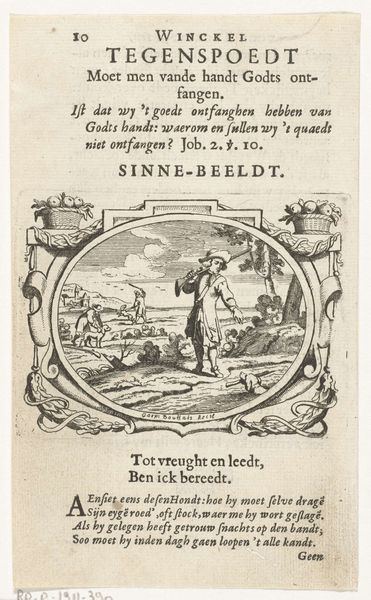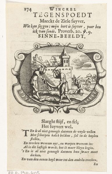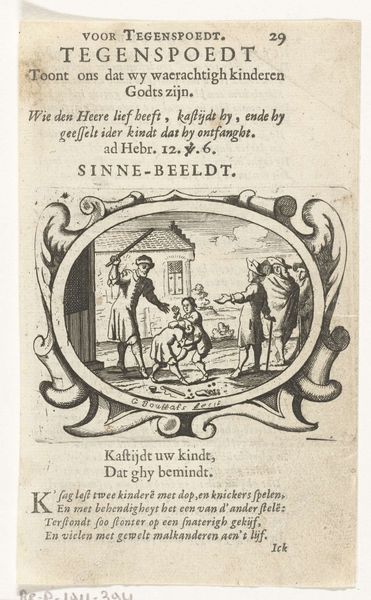 Editor: This is "Tegenspoed test onze trouw," or "Adversity tests our loyalty," a 1679 print by Gaspar Bouttats. It feels allegorical, but the imagery is really domestic. I'm especially intrigued by the contrast between the tranquil church scene and the figure seemingly hard at work at the right. How do you interpret this work? Curator: It's fascinating, isn't it? The combination of everyday scenes and religious undertones certainly points towards a symbolic language. The engraving encapsulates a popular emblem tradition that combines image, text, and moral lesson. What resonates with me here is the deliberate use of archetypal imagery. Editor: Archetypal imagery? Can you elaborate? Curator: Of course! Notice the church, representing steadfast faith. It's juxtaposed with the man laboring, possibly a craftsman, with the bell. Bells in that era symbolized warnings and call to actions, a method of communication, as bells called worshippers to prayer, alarmed against enemies, celebrated festivals, and tolled in mourning. The "Tegenspoed," the adversity, in the title implies these two are linked. Editor: So, adversity is like the bell ringer, testing our faith symbolized by the church? Curator: Precisely. But the two women with their alms bowls also suggest acts of charity and perhaps allude to an audience as well. Together, all of them prompt a deep thinking of trials of one’s loyalty. Think about it: the work presents challenges and devotion intertwined within everyday existence. Editor: It's incredible how much symbolism is packed into one image. I see it now. Curator: Visual culture in the 17th century was sophisticated; artists frequently utilized symbols to embed multiple layers of meaning that engaged the viewer on an intellectual and spiritual level. Editor: This engraving gives me a lot to think about regarding the cultural memory behind those images. Curator: Absolutely! Art is never just what it seems on the surface.