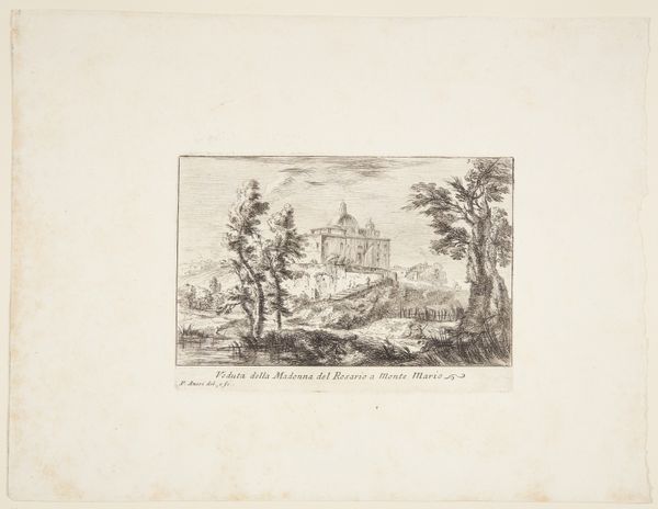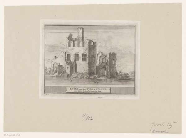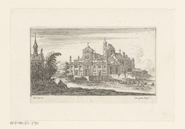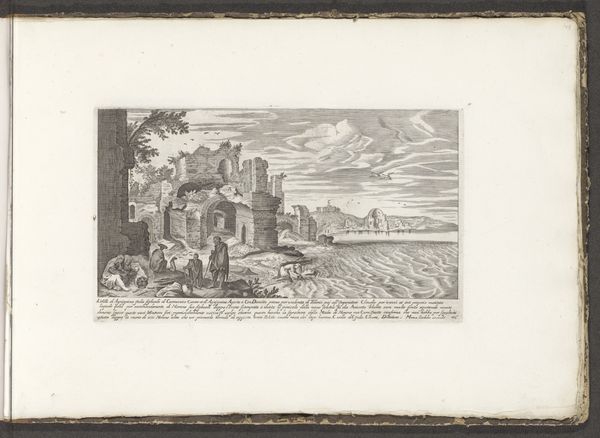 Curator: Looking at this work by Israel Silvestre, made sometime between 1631 and 1657, titled "Another View of the Castle of Bourbon l'Archambault", what are your initial thoughts? Editor: Well, right away, there’s a haunting stillness, like the scene from some long-forgotten ballad. The architectural ruins set against those enormous cloud formations certainly give it an unsettling feel. What strikes you most? Curator: It’s primarily the compositional strategies Silvestre employs to guide the eye. Notice the sharp contrast between the precise architectural rendering and the more loosely defined natural elements. The structure in the foreground is framing everything. Editor: Mmm, yes, the architectural rendering IS incredibly detailed. To me, it feels less like documenting architecture and more like evoking a sense of history weighing on the present. And that history… It seems troubled. What exactly WAS Bourbon l’Archambault back then? Curator: Bourbon l'Archambault, at the time, was a prominent stronghold, and this engraving showcases Silvestre's attention to the geometrical organization inherent in Baroque landscapes, emphasizing a calculated pictorial space, but even I have to admit it evokes something beyond strict representation. Editor: Agreed. It’s as if he’s suggesting that even the mightiest structures eventually crumble. And those clouds… they look ready to swallow everything. The almost ghostly shapes floating in the sky are oddly reminiscent of faces. Curator: Faces, perhaps suggesting figures related to its rich history... Interesting idea. Formally, the balance he achieves is noteworthy given the subject matter; the line work is exceptionally clean for the period, and contributes to the overall impression of a carefully constructed reality, even though we're viewing something in decay. Editor: That “constructed reality” is perhaps what makes it so poignant for me. The decay isn’t just physical; it's as if he captured the crumbling of an idea, a kingdom perhaps, which somehow amplifies the solitude within this grand vista. The two figures present in the bottom right certainly seems dwarfed and pensive, maybe even forlorn? Curator: An astute interpretation. Looking closer reveals new aspects of its construction, it's so much more than just another picture. Editor: I agree!