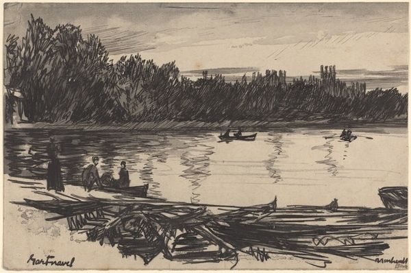 Editor: This is James McBey’s "Albert Basin, Aberdeen," an etching from 1905. It's remarkably detailed, creating a strong sense of atmosphere despite the limited tonal range. It gives an impression of a bustling harbor frozen in a specific moment in time. What historical context informs this work? Curator: The etching offers insight into Aberdeen’s maritime history in the early 20th century. Etchings like these played a significant role in shaping the public's understanding and appreciation of industrial and urban landscapes. Note how McBey doesn't shy away from depicting the busy port, suggesting a cultural acceptance of industrialization's impact. Do you think that contrasts with romanticized views of nature common in earlier landscapes? Editor: Absolutely! It feels much more immediate, less idealized. How did exhibiting something like this impact societal perception? Curator: Consider the social role. Prints made art more accessible, creating a visual dialogue between the art world and wider audiences. Exhibiting such scenes fostered pride and recognition of Aberdeen’s importance. It also offered a sense of belonging, as ordinary people saw their environment represented. Editor: That makes me think about who would buy something like this. Curator: Indeed. Patrons likely included local merchants, shipbuilders, and those who wanted to assert a connection to Aberdeen’s maritime prowess. The art market reflects societal structures. Would this market have valued similar themes to today's market? Editor: Probably not to the same extent, or in the same way. It’s fascinating how it both captured a moment and actively shaped perceptions. Curator: Exactly. Art serves a purpose, be it celebrating commerce or inspiring dialogue about our industrial landscape. Editor: Thank you! I’ll definitely look into McBey's place in Aberdeen’s civic pride.
