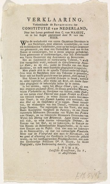 Curator: This intriguing print, held at the Rijksmuseum, is titled "Alliantie tusschen de Fransche en Bataafsche Republieken," dating back to 1795. It's attributed to D. M. Langeveld. What springs to mind for you? Editor: It strikes me as visually dense—all those old-fashioned fonts fighting for attention! And the paper looks so brittle, like it might crumble at any second. There's something about that fragility that speaks to the political moment it represents, don’t you think? Curator: Absolutely. This print served as a propaganda piece, celebrating the alliance between the French and Batavian Republics. It attempts to visually encapsulate a complex political alignment. Notice the allegorical figures; Peace is personified as a young maiden, freedom embodied with an olive branch. Editor: That serpent representing eternity feels a bit ominous, coiled above that altar. And is that supposed to be a leopard being stepped on? It all seems a tad heavy-handed, this symbolism. Is that leopard representing… Curator: Indeed. The print utilizes loaded imagery; the leopard being trampled signifies Britain and aristocracy underfoot. The French Revolution promoted a new world order, and images like these, though somewhat cliché for us now, were powerful visual tools at the time to disseminate that ideology. It's an official decoration designed for Amsterdam's Stadhuis, which is worth remembering. Editor: A decoration, right—so this was intended for public consumption? To sway opinions? You see, that is precisely where the leopard being “stepped on” comes to life to me—as an intentional visual slight that stokes emotion. Talk about impactful imagery... albeit slightly cartoonish in its execution, perhaps! I can still admire its sheer intent to provoke. Curator: Precisely! It illuminates how political ideas are translated into accessible formats to influence the masses. To understand images such as these allows us to unpack the dynamics of alliance building—and, yes, political manipulation—during this revolutionary period. Editor: Understanding the function of such political visuals absolutely helps give meaning to these images now, removing the dust of ages to reveal what drove it—that revolutionary desire! Curator: Right! Analyzing it reminds us art doesn't exist in a vacuum, instead having been intertwined within the ebb and flow of socio-political tides.