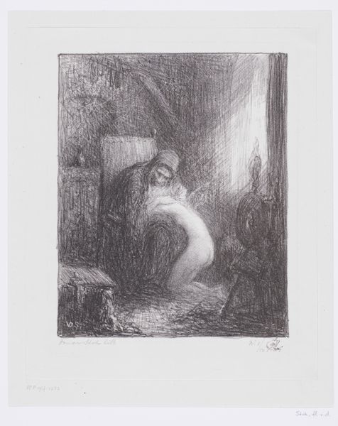 Curator: This etching by Willem Linnig the Younger, created in 1871, is titled "Two Roma Women in a Room with a Harp." Editor: My first thought is the stark contrast between the figures and the implied interior. There’s a softness to the women juxtaposed with the roughness of the etching—an almost unfinished quality to the architecture, drawing attention to the figures themselves. It really emphasizes the hand-worked nature of the print, seeing those visible marks of the etching needle. Curator: Indeed. Etchings such as this, were often used as a form of social documentation at the time. We see this romantic fascination with Roma people—or, perhaps more accurately, a stereotypical representation driven by the cultural imagination of the time. It's a glimpse into how genre scenes played a crucial role in shaping public perception. Editor: I find the depiction of labor conditions really interesting. Observe the textures – the patterns on the shawls, the ornate harp, the detailing on their dresses. I can almost feel the rough spun fabrics and admire the skill employed by whomever made the original garments which the artist saw fit to render into art. Who owned those materials? What class status is implied? And what was the etcher thinking about in rendering the textiles themselves? Curator: The setting within the Rijksmuseum adds layers to these questions. This work resides within an institution that, like many others, historically participated in constructing narratives about marginalized groups. Displaying this image forces us to consider the institution’s role in both preserving and shaping potentially problematic imagery. Editor: Exactly. It asks viewers to look not just at the figures represented, but the network of makers and their social stations who produced, consumed, and perhaps even wore some of the original materials shown in the art, challenging us to really think about our cultural history. Curator: That interplay of representation, material reality, and institutional context offers rich territory for consideration. It moves us beyond just aesthetic appreciation to consider broader issues of power and visibility. Editor: Agreed. A valuable provocation for anyone seeking a richer engagement with art's historical implications.