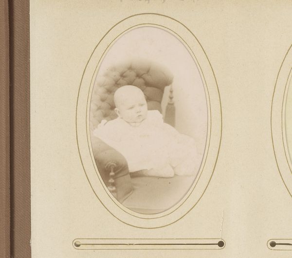 Editor: This is an interesting photo. It's called "Portrait of a Baby, Sitting in an Armchair," created sometime between 1880 and 1900, probably by B.J. Pottjewijd. It's a sepia-toned photograph and, looking at this chubby baby staring blankly, I immediately wonder – what was life like for babies at that time? What do you see in this piece? Curator: I see more than just a simple baby portrait; I see a constructed symbol. The heavy armchair dwarfs the infant, becoming a throne, almost. Consider the cultural weight of posture and presentation in 19th-century photography. Babies, often symbols of purity and hope, were carefully positioned to convey specific messages. Editor: So, the chair itself is a symbol? How so? Curator: Absolutely! Think about the rigid formality. The buttoned upholstery, the tasseled arms… These are indicators of bourgeois status and aspiration. Placing a baby, typically unbound, within this framework creates an intriguing tension. Does it hint at the constraints placed upon future generations? Or perhaps a quiet wish for the child to rise through the class system? What feelings does the tasseled chair elicit for you? Editor: I hadn’t thought of it like that, it adds so much meaning to an everyday object! The tasseled chair and the baby almost feel separate, now that you mention it. There is something both funny, and sad, about this contrast. Curator: Precisely. It makes us question the narratives we impose through imagery and material culture. It speaks of both vulnerability and enforced social identities, and the continuous reshaping of innocence. Editor: I will never look at old baby photos the same way again. This makes me see it from such a completely new perspective! Curator: And that's the power of symbols! They continue speaking to us across time, shifting their message depending on our viewpoint and societal norms.