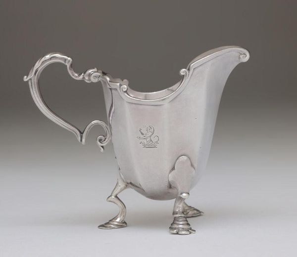 Editor: This gleaming, shell-shaped sauce boat was created in 1747 by François van Stapele and is crafted from silver. It’s perched on these adorable little curved legs! What immediately strikes me is its opulence and playfulness, and I’m curious – how does this object reflect the social landscape of its time? Curator: This sauce boat embodies the Rococo style, deeply entwined with the aristocracy. Silverware like this was not merely functional; it was a statement of wealth and refined taste. Consider the setting: lavish dinners, elaborate social rituals. This object played a role in solidifying social hierarchies, marking its owner as someone of importance. Editor: So, owning something like this elevated a person’s status? Curator: Precisely. Think about the process too. Crafting such an intricate object demanded specialized labor. These were made in workshops within specific European trade Guilds. The art market was deeply rooted in economics. Objects such as these were for very, very rich people. Owning and displaying it communicated a degree of authority to those who saw it. Does that resonate with your understanding? Editor: Absolutely, that makes sense! It wasn’t just about having a nice sauce; it was about showing you could afford to have a nice sauce in a ridiculously fancy boat. It says, "I'm at the table," and not "I'm serving at the table". Curator: Exactly! The politics of imagery are subtle, but profound. We still use objects to display social belonging and aspire to social status today. So next time you have to use a knife or fork, perhaps think about the power dynamics behind what you use to consume sustenance. Editor: I definitely will. It’s eye-opening to see how much this little sauce boat can tell us about 18th-century power structures. Curator: It also is a delicious artifact of craft and care. So glad you're feeling this way about this Rococo dish.