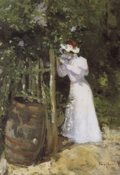 Jules-Frédéric Ballavoine's oil painting invites us into a serene, hazy landscape where soft greens and muted tones evoke a sense of calm observation. The composition divides into distinct zones: the foreground, where a woman in a pink dress is seated under a red umbrella, and the background, where horses race across a field. The hazy atmosphere subtly blurs the distinction between the zones, creating a unified visual experience. The woman, rendered with gentle brushstrokes, becomes a focal point, and the artist positions her at the intersection of color and form. The painting seems to question the rigid definitions of spectator and spectacle. Ballavoine uses the play of light and shadow to suggest the transient, ephemeral nature of experience. The formal elements work together to create a dynamic interplay between stillness and movement, inviting reflection on how we perceive and interpret the world around us.