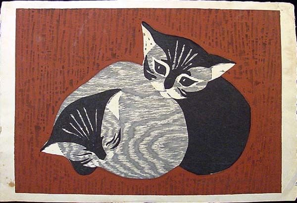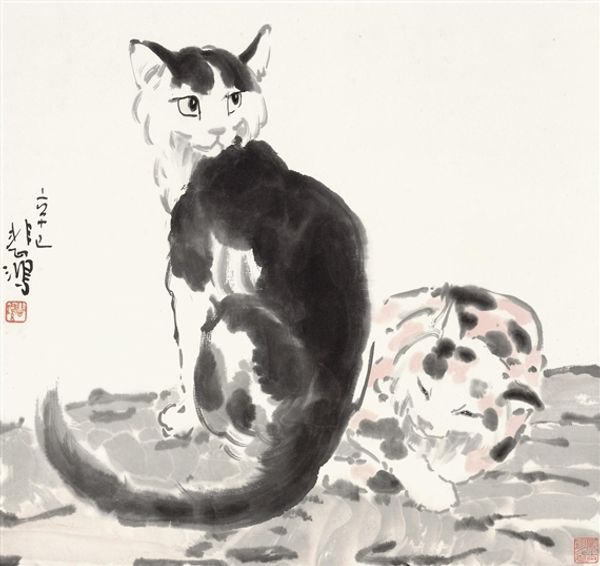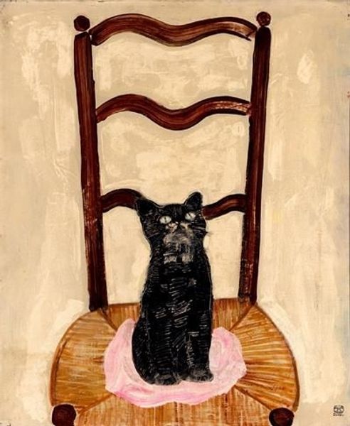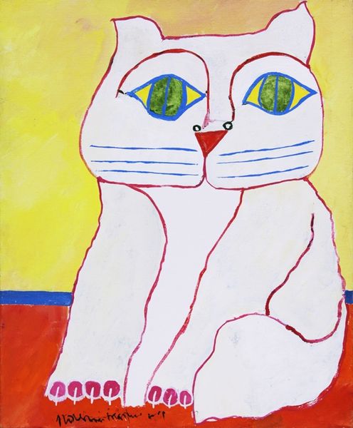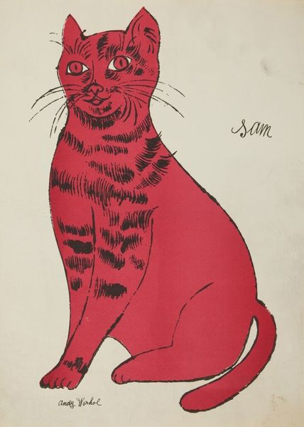 Curator: Let's explore Piroska Szanto's drawing, titled simply, "Cat." Rendered in pencil and graphite, it presents a unique take on feline representation. Editor: It's oddly regal, isn't it? Like a cat-pharaoh in minimalist garb. And that tongue sticking out just slightly kills me! A master of passive-aggressive judgment, if I ever saw one. Curator: Indeed. Notice the interplay between the positive and negative space created by the dark background and the white and pink lines? It’s an economical drawing, focusing on essential form. The artist uses geometric shapes, such as the vertical lines that suggest its chest or the circles making up much of its body, to render the cat in a very stylized manner. Editor: Stylized for sure. There's a wonderful sense of both vulnerability and irony there, almost as though the cat is mocking the idea of 'catness'. That elongated neck almost makes it seem surprised to exist! Curator: The symmetry is certainly notable, isn't it? Though the head has subtle asymmetry. This controlled contrast is an artistic device that animates the image while maintaining the compositional rigor of a portrait. And look how flat it is! It almost defies depth and challenges the viewer's spatial perceptions. Editor: You know, its gaze almost pulls you in. But I can’t help imagining this feline bursting into existential monologues between naps. Its eyes express world-weariness that mirrors our own chaotic inner realms. Perhaps it represents how the world sees us right now, an outsider peering back. Curator: It is striking how the artist merges representational and abstract modes to explore our fascination with cats. Its presence prompts one to meditate on the human/animal dichotomy within our perception. Editor: In the end, I just appreciate that cheeky tongue! Art is meant to elicit emotional connections and reactions and Szanto nails it by embracing humor, however understated it may be. Curator: Indeed. This concise feline form prompts the contemplation of formal choices and the intersection of the familiar and uncanny.