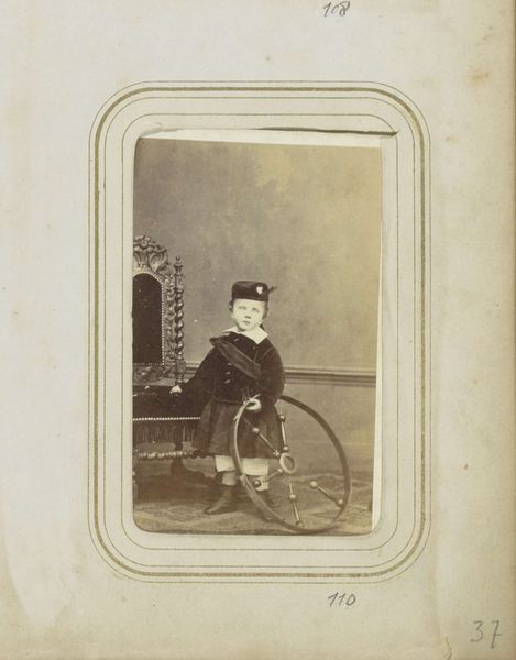 Curator: Welcome. The work before us is entitled "Portret van een jongen, staand bij een stoel" - "Portrait of a boy, standing by a chair." We estimate its creation between 1860 and 1900, captured through the emerging medium of photography, now attributed to Gerarda Henriëtte Matthijssen. Editor: It's a strikingly melancholic piece. The child looks burdened, doesn't he? There's a stiffness to his pose and a shadow in his eyes. It almost feels staged, too formal for genuine childhood emotion. Curator: The formal elements are very much a product of their time. Photography was becoming increasingly accessible, yet it retained an element of ritual. Consider the social and cultural pressures on children then—their visibility within a family’s socio-economic aspirations. This is as much a performance of ideal childhood as it is an image of an actual child. Editor: Yes, and look at the elaborate detailing on the chair – and even his clothes, it's all so considered. One has to imagine the manufacturing of such ornate objects was part of this boy's family identity and position within society, no? Curator: Precisely! His posture against the chair and the fashionable, if somewhat adult-like, attire become performative signals, marking out his place within the burgeoning middle classes. One wonders about the labor and industries that allowed for this representation. Who made that chair, who made the boy's suit, what were their lives like in relation to the boy’s? Editor: Interesting questions to pose given that photography at that time required extensive processing. Considering the collodion process, the tintypes, and the equipment involved, do we know who precisely printed or assembled this image? Perhaps thinking of that worker would also illuminate the boy's class. Curator: Indeed. The means of photographic production in this context open new avenues for investigation. As for the sitter's experience and presentation, he could represent childhood expectations but perhaps he resisted expectations in ways that were, even now, preserved. Editor: A good point, and to move even further, considering photography as a material practice reveals layers beyond its representative function, offering tangible connections to a long past. Curator: It is definitely much to consider, both historically and artistically. Thanks! Editor: Absolutely. Food for thought about production and consumption across generations.