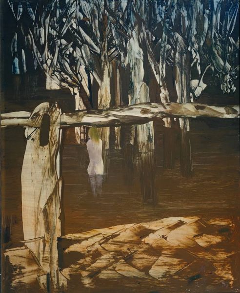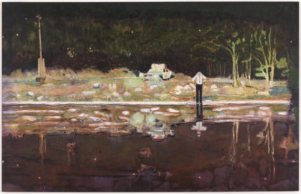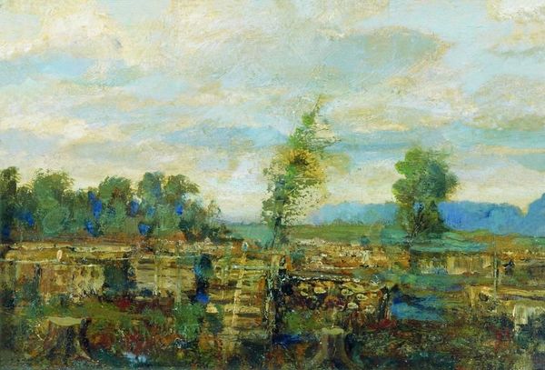 Editor: Here we have Konstantin Korovin's "First Steps of Prospectors in the Tundra," painted in 1894 using oil. There’s an immediate feeling of bleakness. It’s not a comforting landscape, and the figures seem almost lost in it. What’s your interpretation of this work? Curator: This work reflects the social and political context of late 19th-century Russia, where expansion and resource extraction were heavily promoted by the state. Consider the title: "First Steps." It frames this as the beginning of a major enterprise. Do you think it conveys promise or exploitation? Editor: Hmm, leaning towards exploitation given the environment. The landscape seems to push back against their intrusion. Curator: Precisely. The muddy terrain and dense forest suggest the difficulties faced by these prospectors. This "impressionistic" rendering isn’t just about light and color, it communicates the raw, challenging realities of this kind of expansion. How do you think the public viewed these endeavours at the time? Editor: I guess with a mix of patriotic pride and anxiety about the unknown, given that most would be living quite separate lives in very different environments. Curator: And the museums and exhibitions of the period reinforced certain narratives – often glorifying these ventures. Consider the role of art in shaping public opinion and even justifying government policies. This work may subtly critique this dominant narrative by portraying the harsh reality. Editor: That makes me rethink my initial reaction. It’s less about inherent bleakness and more about a commentary on Russia's drive eastward, and its human cost. Curator: Exactly. It provides a complex image reflecting its society, something that has stuck with me. Editor: I never would have considered it beyond its aesthetic value; thanks, this has been truly insightful.